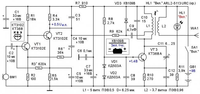 От других подобных схем РМЛ2 (см. рисунок 1) отличается высокой экономичностью и, работая от 9 - вольтовой батареи типа «Корунд», может потреблять ток от 6 до 15 мА, не более. Так как предельно допустимый ток разряда «Корунда» 20 мА, то в схему РМЛ2 введён светодиодный индикатор HL1 включения питания. При небольшом (2 мА) потребляемом токе он не перегружает батарею «Корунд», но заметно повышает удобство эксплуатации РМЛ2. Кроме того, в схеме генератора РМЛ2 применён оригинальный способ установки базового напряжения смещения, позволяющий заметно снизить уход частоты генерации при разряде источника питания.