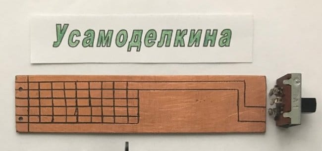 На рисунке 5 изображена копия платы, использованной для макетирования и настройки РМЛ2. Плата сделана из двухсторонне фольгированного стеклотекстолита. Нижняя сторона платы оставлена для экрана, а верхняя разрезана резаком на прямоугольники размером 10 х 4 мм. На верхней стороне были размещены почти все детали РМЛ2. Правая (не расчерченная на клеточки) часть ПП предназначена для установки GB1.
