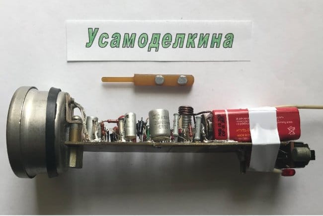 В случае получения неудовлетворительных результатов, следует изменить ёмкость конденсатора С10 и повторить настройку. Для уменьшения времени настройки рекомендуется конденсатор С10 заменить подстроечным с ёмкостью 6…30 пФ. При получении удовлетворительных результатов настройки амплитуду резонанса колебательного контура можно попробовать дополнительно увеличить, изменив на 5…10% количество витков катушки L1. Как известно, амплитуда колебаний будет максимальной при определённом балансе составных частей колебательного контура, то есть когда реактивные сопротивления L1 и С10 равны. Грубая настройка колебательного контура L1-С10 осуществляется подбором количества витков L1 и (или) изменением ёмкости С10. А плавная настройка выполняется подстроечным сердечником. Наличие резонанса можно, также, контролировать по минимуму I потр. радиомикрофоном от GB1. (Как известно, сопротивление параллельного колебательного контура на частоте резонанса стремится к бесконечности). Для контроля I потр., во избежание заметного «ухода частоты», следует использовать миниатюрный самодельный миллиамперметр с минимальной длиной соединительных проводников.
