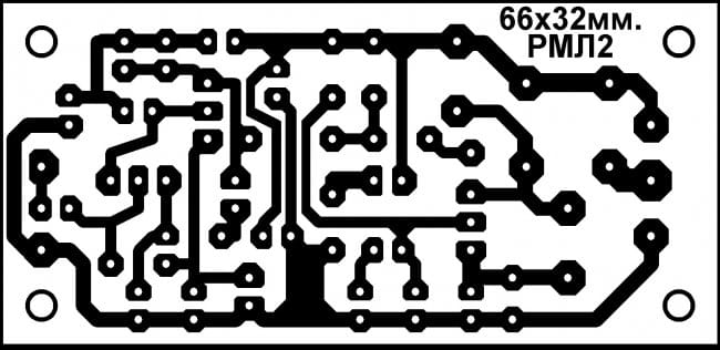 Верхняя сторона платы (на которой располагаются детали) является экраном, и медная фольга с неё не снимается. Чтобы выводы РЭК не замыкались на экран, все отверстия под выводы РЭК зенкуются сверлом диаметром 1,6 … 2,2 мм. Экран электрически соединяется с общим проводом РМЛ2.