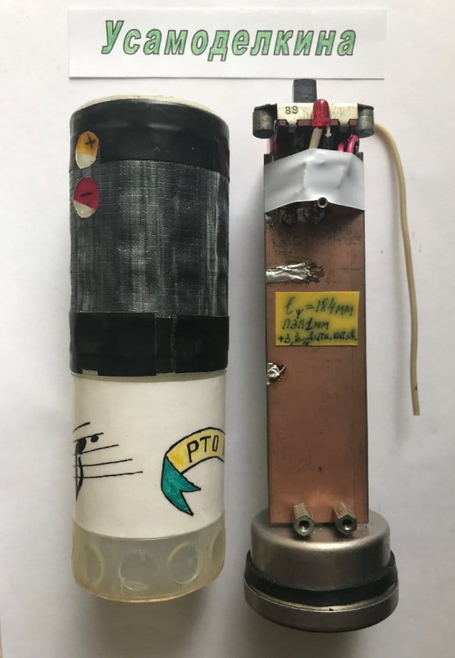 Плата РМЛ2 установлена во флакон из-под шампуня (см. рисунок 6) диаметром 45 мм из мягкого (не хрупкого) пластика или полиэтилена. У флакона отрезаны сужающееся горлышко и пробка, так чтобы получился стакан - цилиндр 140 х 45 мм. WA1 – короткий штырь одет в ПВХ трубку и при фотографировании загнут для увеличения масштаба фото. Аккумулятор GB1 вместе с WA1 зафиксирован двумя слоями белой изоленты.