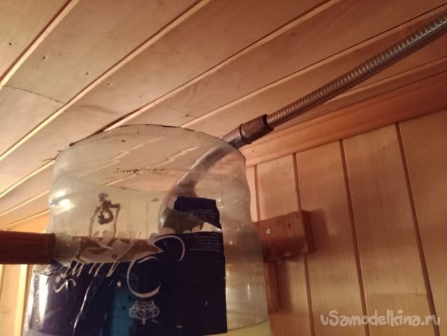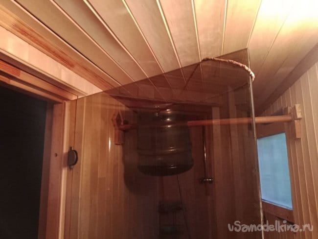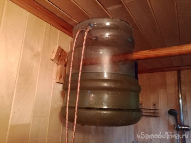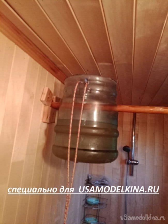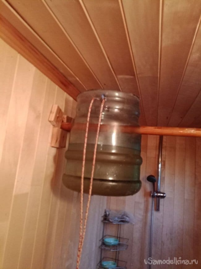 Доброго всем времени суток, очередная самоделка, надеюсь, полезная. У многих на даче есть баня, а у некоторых даже бассейн, как у меня. Все три штуки крайне полезные и приятные, но иногда нас с женой тянет приехать попариться и зимой. Бассейн, понятное дело, зимой замерзает, а после парилки хочется окатиться холодной водичкой. И вот однажды я поставил заледенелую баклажку 20 л в парилку, чтоб оттаяла, но поставил слишком близко к печке, и она оплавилась. Форму потеряла. И пришла мне в голову идея сделать из баклажки ушат. А поскольку я с фантазией, я решил, что пусть ушат будет дистанционно управляемый парщиками. За верёвочку потянул - ушат холодненькой на загривок получил. Красота! Спилил болгаркой горлышко, получилась бочка. Отверстия прорезал, черенок от лопаты вставил, получилась переворачивающаяся бочка. Верёвочку пришпилил - получилось дистанционное управление. Дальше надо это как-то к стенам пристроить, под рукой были бруски, из них и получились быстросъёмные коннекторы. Теперь самое время подумать, как это всё наполнять водой. В баню у меня вода поступает самотеком из бочки в доме под самой крышей. Чтоб минимум переделок, душевую лейку вставляем и кран открываем. А чтоб лейка не выпадала, в потолок вкручиваем клипсу. Чудеса, всё заработало с первого раза, обычно так не получается. На черенке осталось место для второй баклажки, но пока обходимся одной. Её ещё можно двигать по черенку вправо-влево, кому как нравится. И вишенка на торте: после принятия банных процедур положено парилку и форточку открыть для просушки, так стартовая верёвочка от этого обливника прекрасно держит стеклянную дверь парилки за угол, раньше надо было её стопорить чем-нибудь, закрывалась из-за кривизны фундамента. Воды в устройстве хватает на двоих, таким образом, и парящий (или парщик?), и паруемый (или опариваемый?) получают максимально удовольствие от процесса