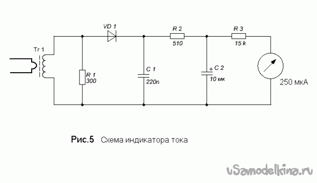На платке из одностороннего текстолита (21х38 мм) вырезаны дорожки-пятаки согласно схемы (Рис.5). К ним припаиваются радиоэлементы.