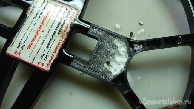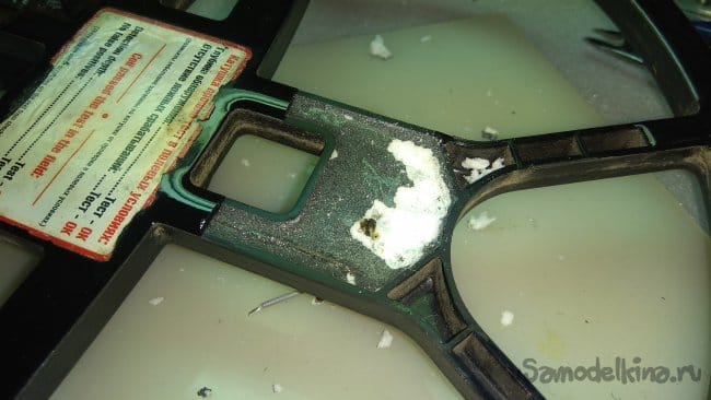 Из чего напыление не совсем понятно, похоже графит или что-то близкое. Расковыриваю дальше, там материал белый, что-то типа эпоксидки с содой, сильно крошится.