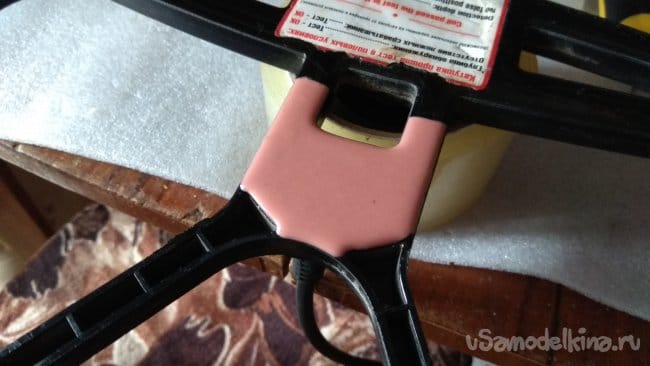 Первая заливка: решил все залить двухкомпонентным эпоксидным клеем «Хват». Хорошо бы восстановить внутренний экранирующий слой, но побоялся отломать тонкие провода. Через пару дней приступил к внешнему защитному покрытию. Предварительно сделал экран из кусочка фольги от шоколадки, прижал его внешним экранирующим проводником. Заливаю второй слой эпоксидного клея.