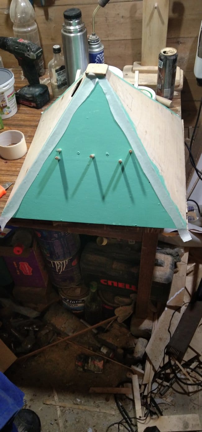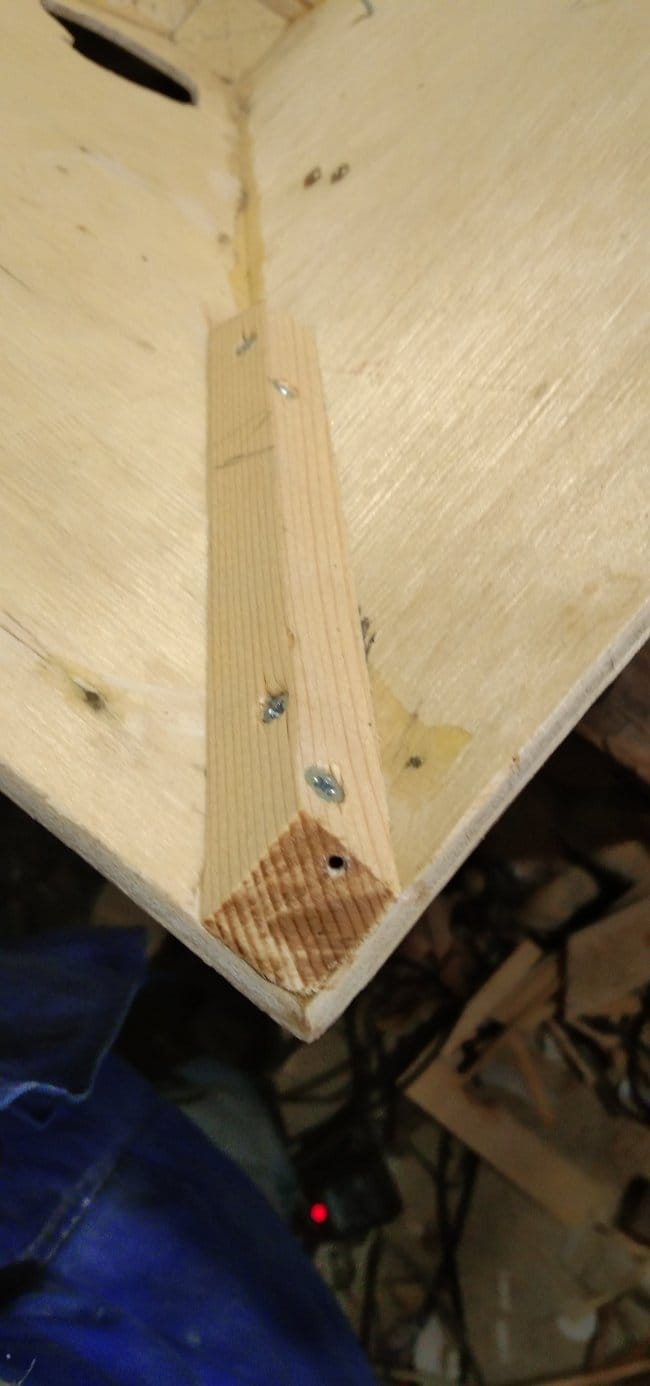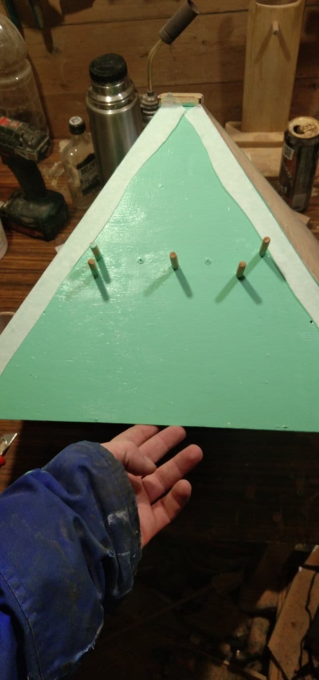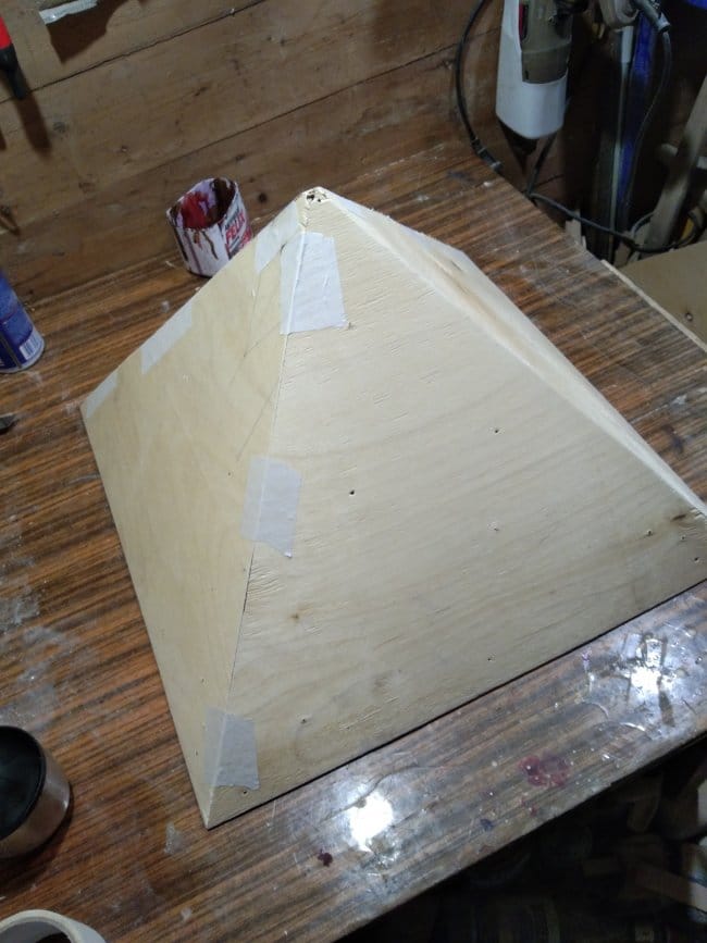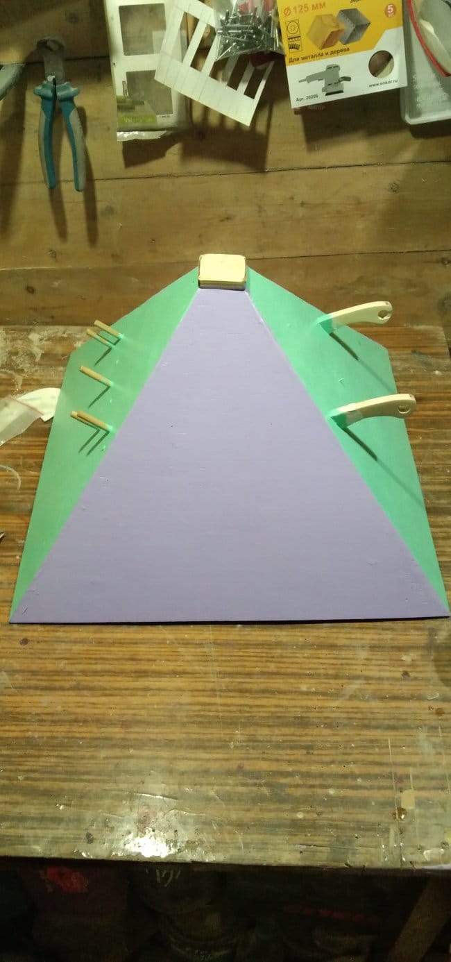 Теперь необходимо установить дно пирамидки. Для этого были установлены планки в нижней внутренней части пирамиды. 4 штуки, по углам. Затем из фанеры, так же 4 мм. было вырезана по размеру крышка для дна. Нанеся на нижнюю часть пирамиды клей, приложил фанеру и по краям, в ранее установленные планки завернул саморезы. После высыхания периметр дна был укреплен скобами. На фанере дна были заранее размечены и высверлены отверстия для установки колес. После всех манипуляций все изделие полностью шлифуется, убираются все неровности и дефекты фанеры, скобы заглаживаются и где это необходимо молоточком вбиваются в фанеру, чтобы были "заподлицо".