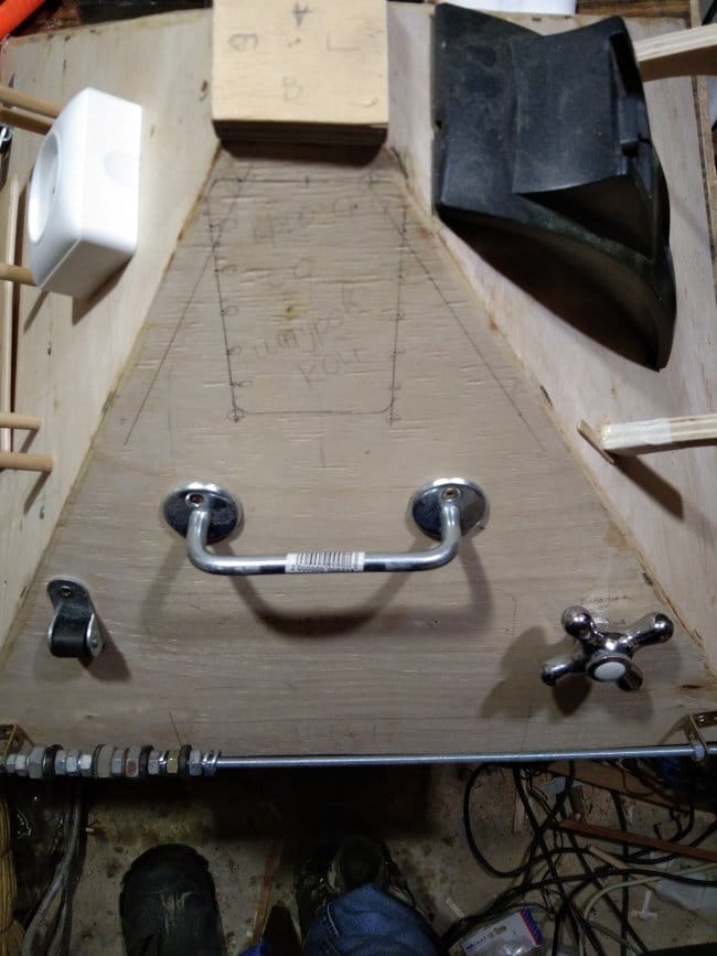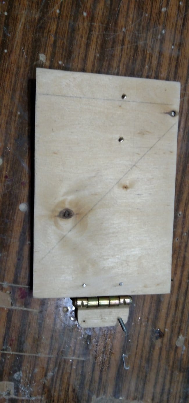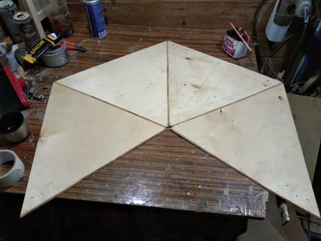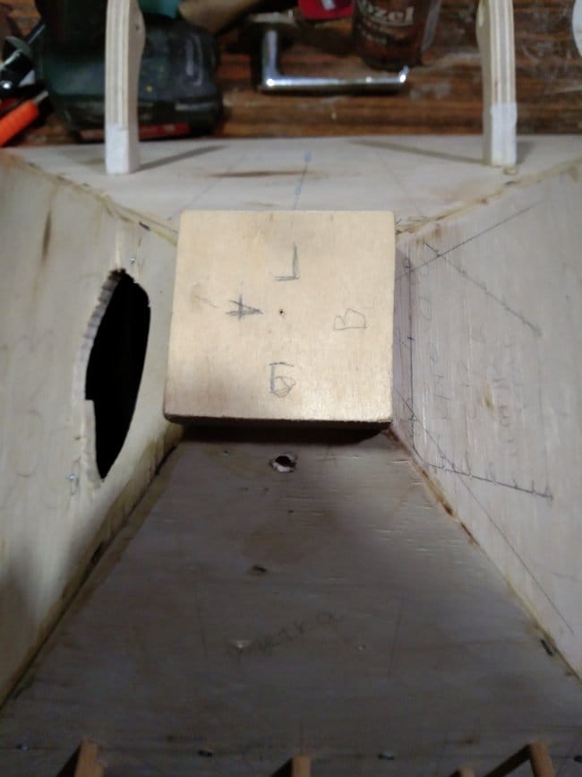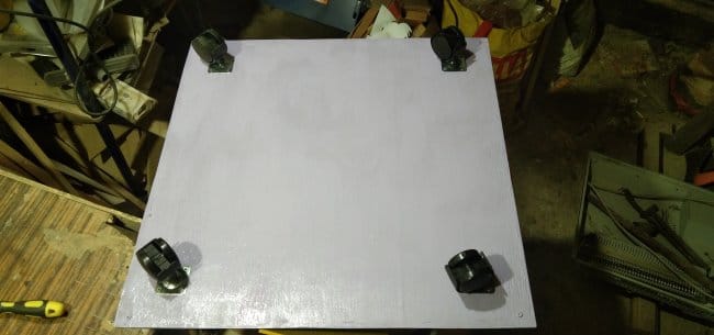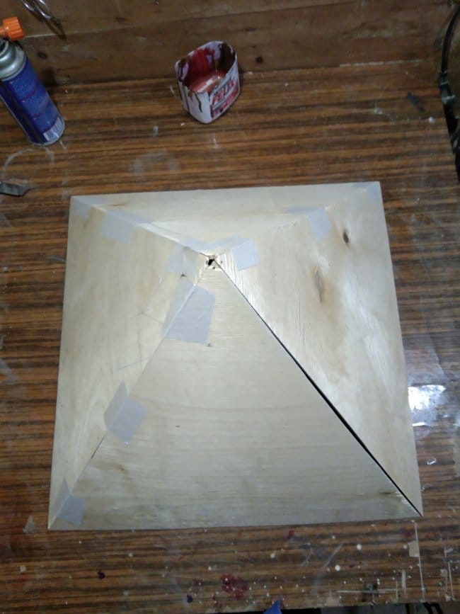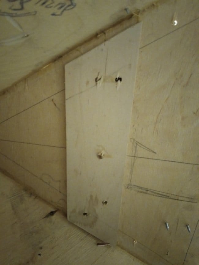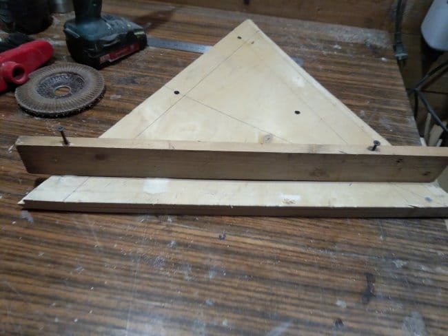 Теперь необходимо установить дно пирамидки. Для этого были установлены планки в нижней внутренней части пирамиды. 4 штуки, по углам. Затем из фанеры, так же 4 мм. было вырезана по размеру крышка для дна. Нанеся на нижнюю часть пирамиды клей, приложил фанеру и по краям, в ранее установленные планки завернул саморезы. После высыхания периметр дна был укреплен скобами. На фанере дна были заранее размечены и высверлены отверстия для установки колес. После всех манипуляций все изделие полностью шлифуется, убираются все неровности и дефекты фанеры, скобы заглаживаются и где это необходимо молоточком вбиваются в фанеру, чтобы были "заподлицо".