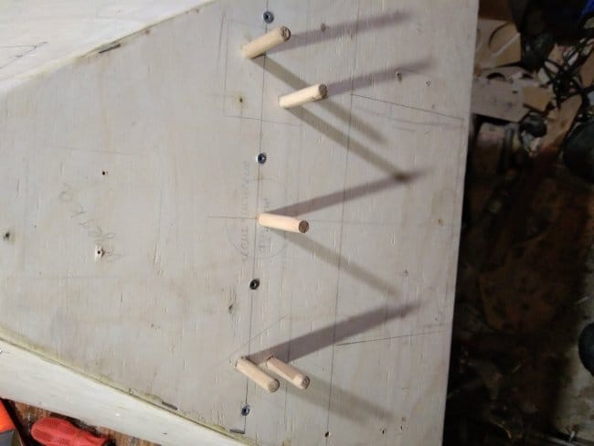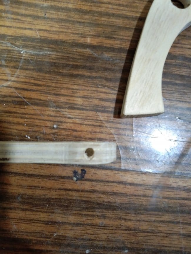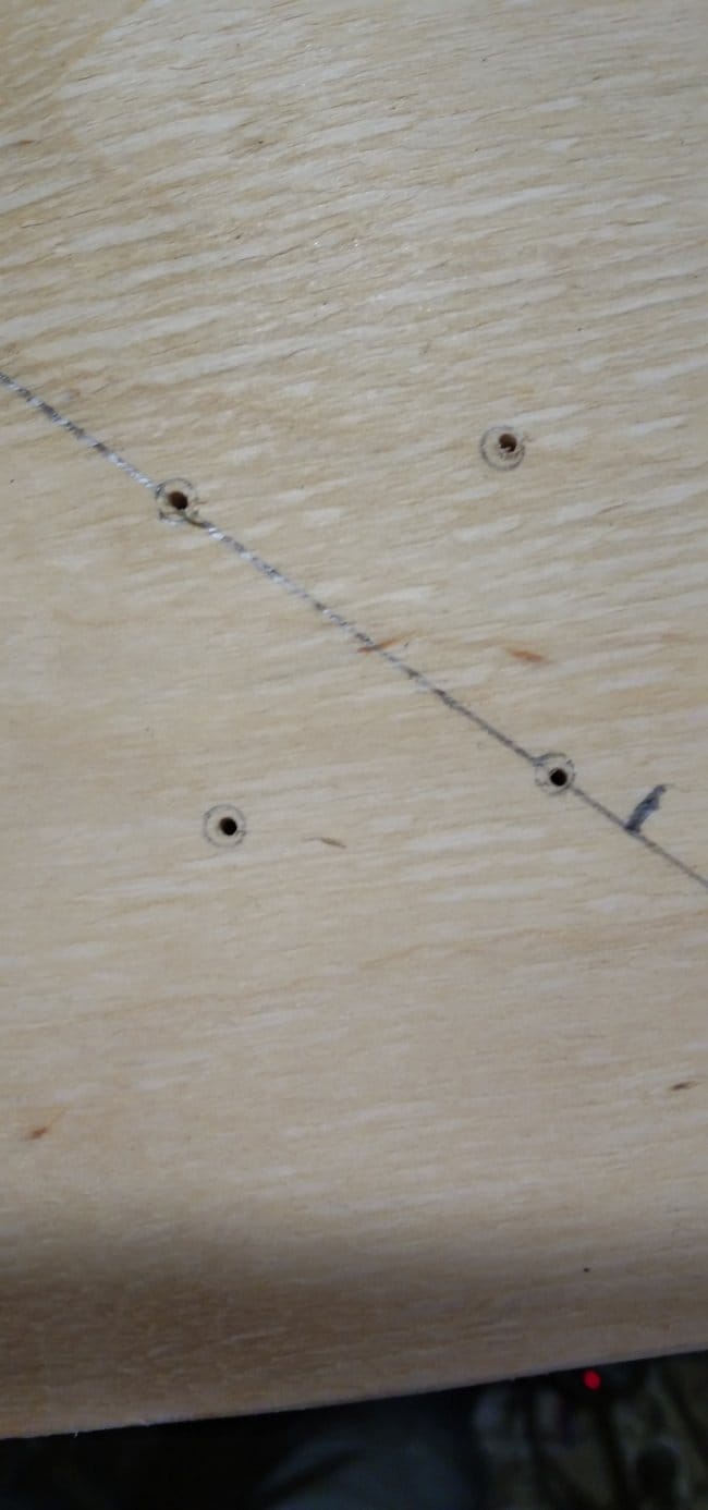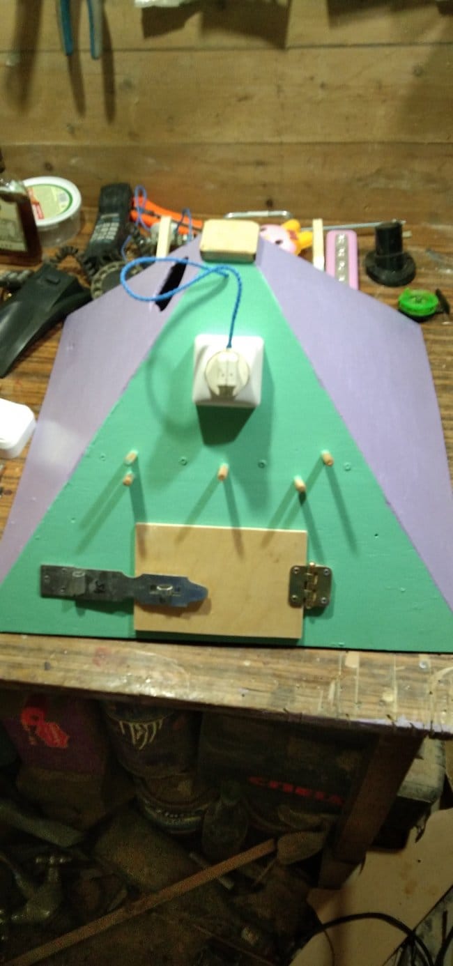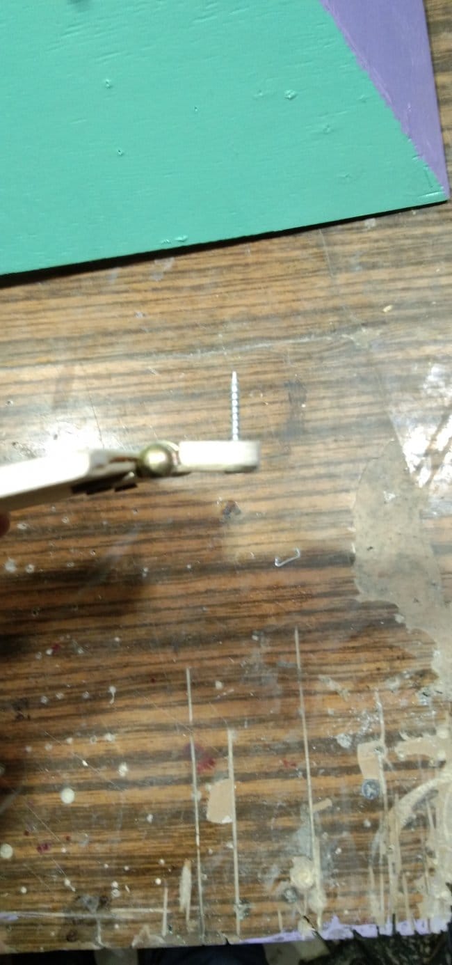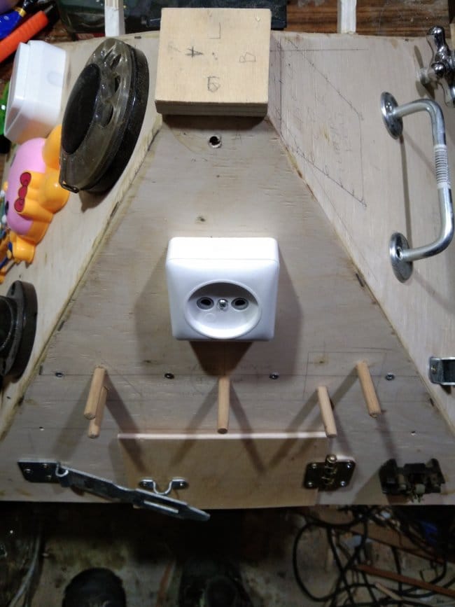 Из фанеры были вырезаны и вешалки для установки колокольчиков. В них сделаны по нескольку отверстия для удобного продевания и крепления шнурков для колокольчиков. Изначально они были приклеены к стенке и изнутри закручен саморез. Но в дальнейшим, уже после окраски я установил по бокам вешалок уголки. Их закрепил саморезами и болтами. Так надежнее.