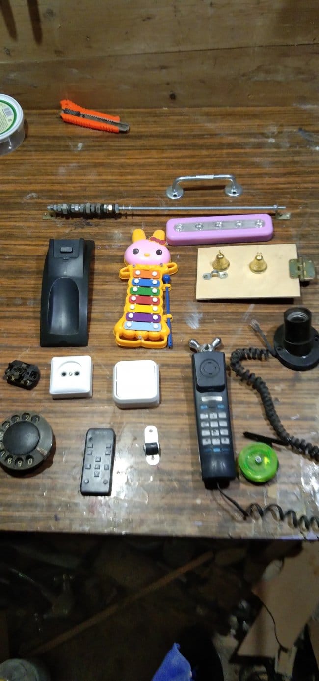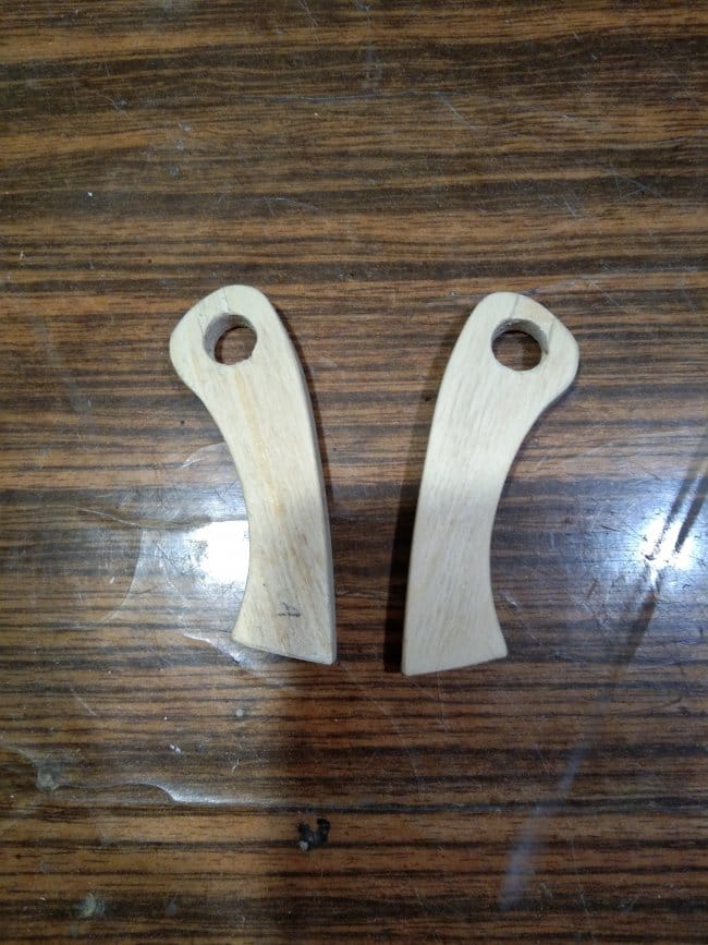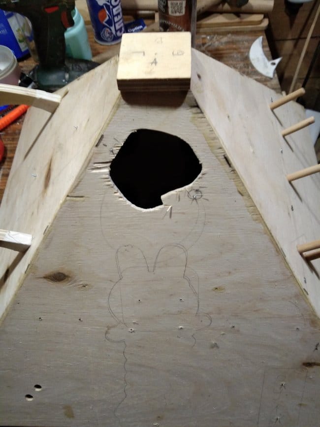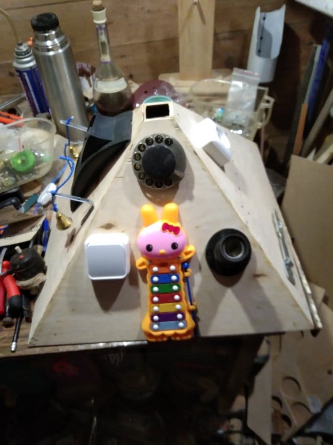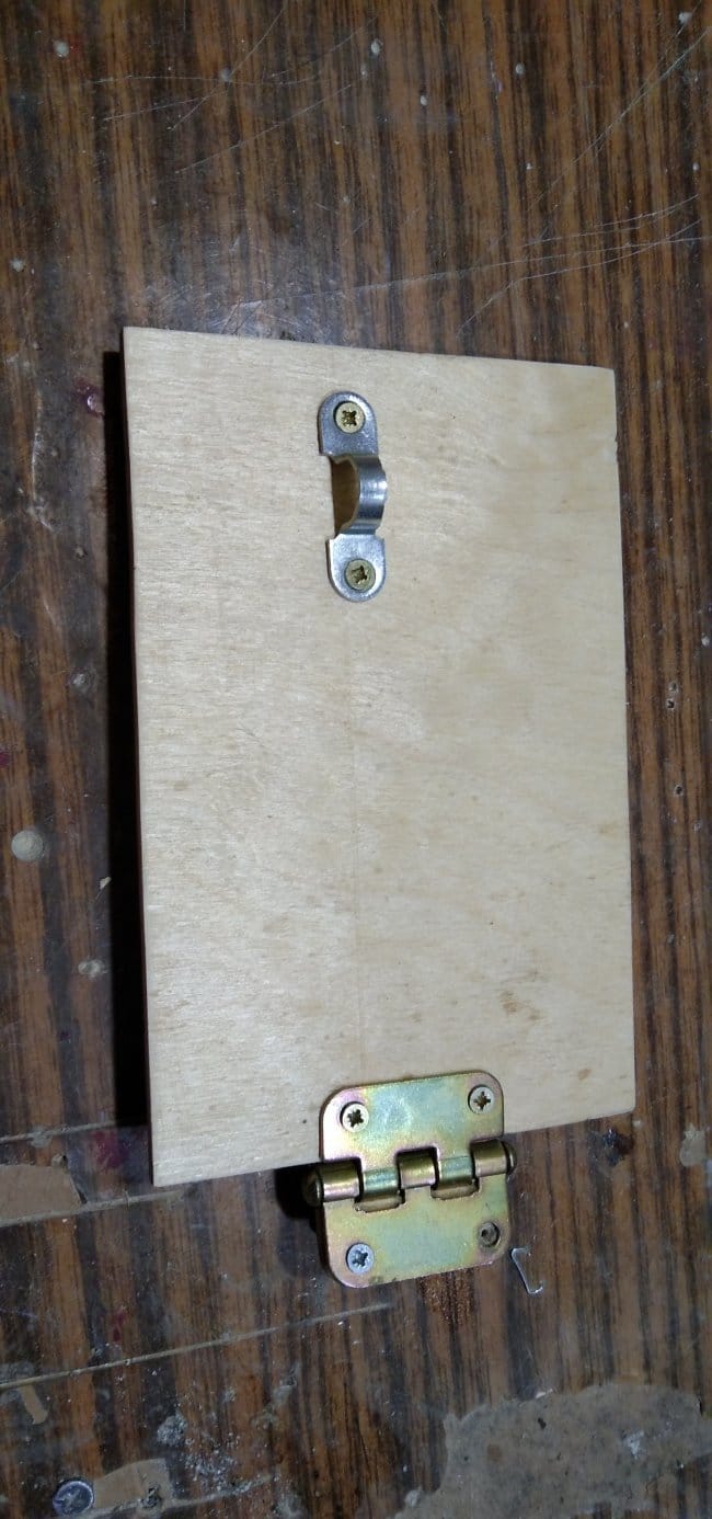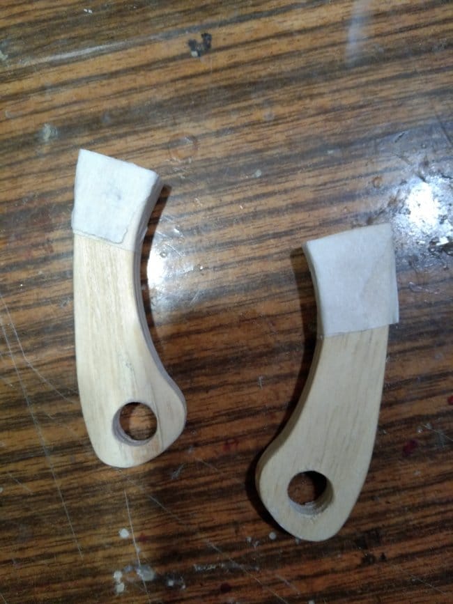 Из фанеры были вырезаны и вешалки для установки колокольчиков. В них сделаны по нескольку отверстия для удобного продевания и крепления шнурков для колокольчиков. Изначально они были приклеены к стенке и изнутри закручен саморез. Но в дальнейшим, уже после окраски я установил по бокам вешалок уголки. Их закрепил саморезами и болтами. Так надежнее.