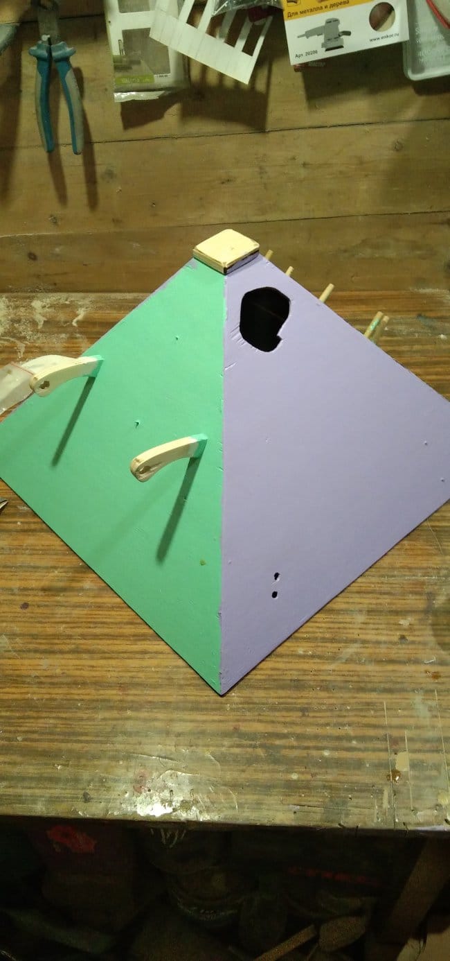 Далее, разложив все что я приготовил для установки на стороны, начинаю размечать что и куда прикрепить. На стороны начинаю крепить детали на черновую, т.к. все они будут сниматься для удобства обработки и покраски сторон изделия. В необходимых местах приходится вырезать отверстия для более плотной установки игровых предметов. Так же было решено установить на одну из сторон съёмные геометрические фигурки. По задумке они должны устанавливаться на штырьки которые будут торчать из стенки пирамиды. Но т.к. стенка пирамиды имеет толщину всего в 4 мм, этого недостаточно для прочного соединения штырьков. Поэтому была взята фанера толщиной 12 мм или около того и вырезан кусок для установки внутри самой пирамиды. Его я установил на предполагаемое место установки штырьков. Намазав деталь клеем и для прочности вкрутил саморезы. Из дерева выпилил три разных фигуры - круг, треугольник и квадрат. Каждой фигурки по 3 штуки. В них высверлил отверстия. Разметил на пирамиде и так же сделал отверстия под шканты. На верхушку установил заглушку из фанеры.