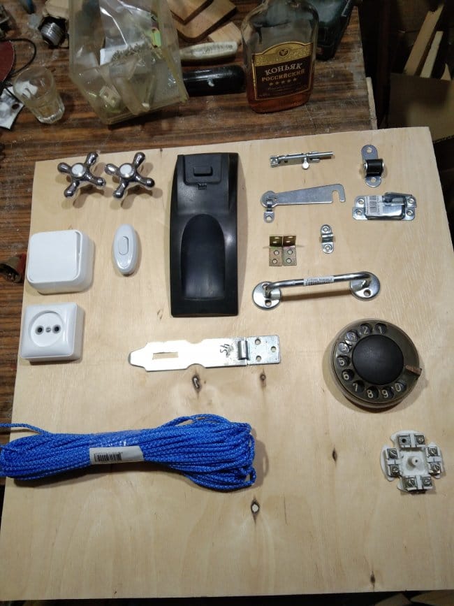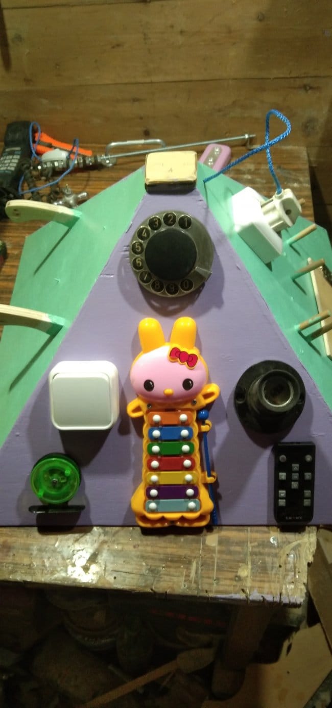 Необходимый цвет был получен с помощью колеров. Выкрасив две противоположные стороны одним цветом, после высыхания на их грани была приклеена малярная лента, чтобы краска другого цвета не испачкала уже окрашенную сторону. Изготовил еще одну деталь для бизиборда - открывающуюся дверцу. Установил ее на нужное место. После высыхания уже на постоянной основе закрепил и установил все игровые детали на сторонах изделия.