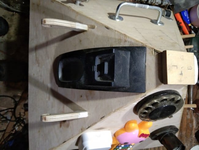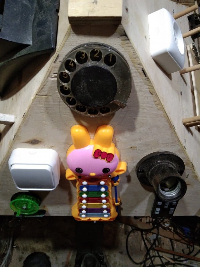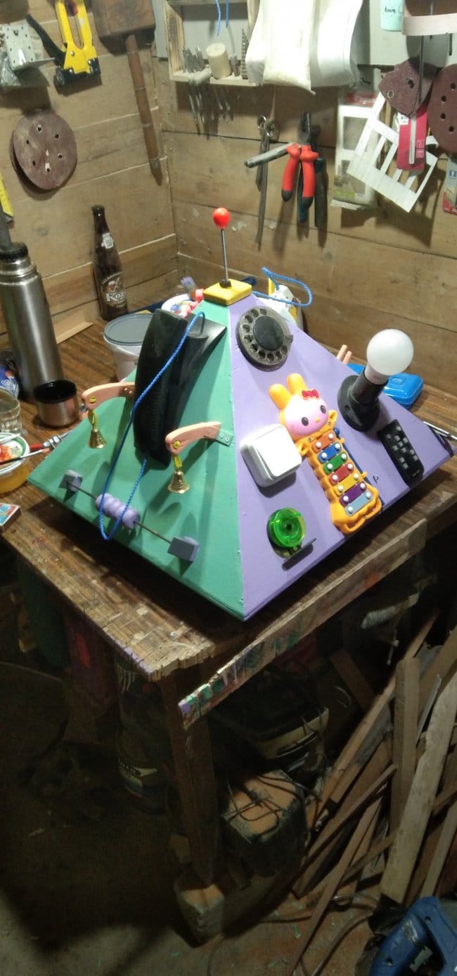 Последний этап - это установка колесиков на дно бизиборда. Их я захотел установить после того, как вспомнил, как мой ребенок постоянно переползал от одной стороны домика, на другой. Мне показалось это не очень удобным. Поэтому в этом бизиборде колесики помогут ребенку иметь более быстрый доступ к каждой стороне бизиборда. Достаточно просто толкнуть его рученкой и одна сторона сменит другую. Так же в данной модели имеется веревочная ручка, за которую ребенок сможет таскать за собой изделие как тележку!
