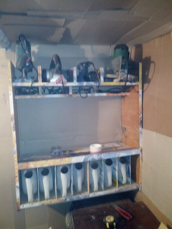 Теперь о ящиках. Их я сделал из канистр из-под жидкости для омывания стекол автомобиля. Данные канистры из-за своей нестандартной не прямоугольной формы не совсем удобны для использования их в таких целях. Но мне они подошли, т.к. ничего крупного в них хранить я не намерен. Вырезав у канистры ее полукруглую часть я получил нужные мне ящики. Вставляю их в изготовленные отсеки.