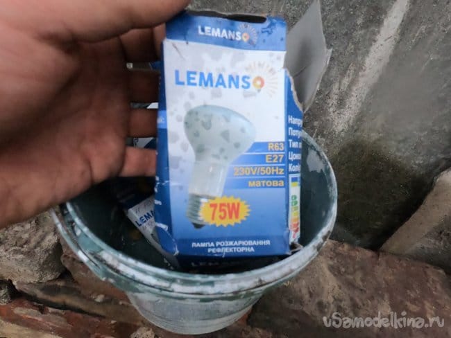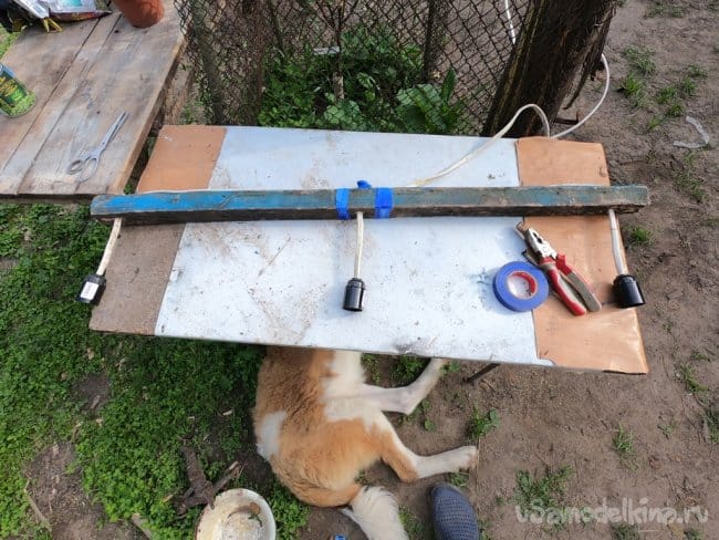Режем и соединяем кабель, у меня патроны подключены параллельно. Можно использовать мощные красные лампы и подключить их последовательно, чтобы они долго служили. Но будучи в городе, у меня заканчивались деньги, а продавщица порекомендовала обычные лампы накаливания с рефлектором, мол их берут для таких нужд. В ходе испытаний в магазине оказалось, что даже при мощности 75Вт лампы неплохо излучают тепло.