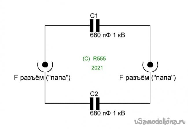 Она очень простая. Роль защитных элементов выполняют высоковольтные керамические конденсаторы относительно небольшой ёмкости. Сопротивления токам высокой частоты, коими являются телевизионные сигналы они практически не оказывают, соответственно не ослабляют сигнал. Но для частоты сети 50 Гц они представляют собой высокое сопротивление. Таким образом, при попадании сетевого напряжения на антенный кабель, ток будет ограничен до безопасного для ТВ аппаратуры уровня.