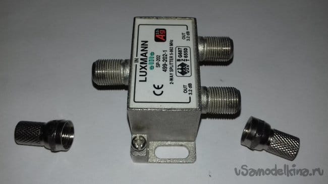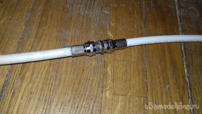Некоторое время я раздумывал над конструкцией устройства. А именно, как сделать, чтобы включить его без переделок существующей кабельной сети. Пришёл к решению на входе и выходе устройства установить F-разъёмы типа "папа", это позволит подключить девайс к сплиттеру и подводящему кабелю через соединитель. Как показано на фотографиях.
