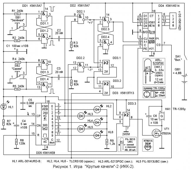 По окончании стартовой предустановки счётчик DD5 начинает увеличивать своё содержимое на единицу по каждому отрицательному перепаду напряжения на счётном входе CP (выводе 13). При этом, после каждого нечётного отрицательного перепада, высокий логический уровень появляется на выходах «1», «3», «5», «7», «9» (выводах 2, 7, 1, 6, 11 соответственно). Это приводит к последовательному включению светодиодов HL2 … HL6. Каждый СДИ включается после паузы, объясняемой наличием и чётных (а не только нечётных) отрицательных перепадов напряжения на входе СР (выводе 13) DD5, после которых логическая 1 появляется на незадействованных выходах «2», «4», «6», «8», «0» (выводах 4, 10, 5, 9, 3 DD5 соответственно). Зажигание зелёного HL3 и синего HL5 сопровождается тональными сигналами зуммера HA1, приглашающего игроков начать нажимать на кнопки.