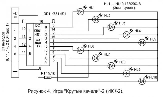 Второй блок – DS (дешифратор) DD1 К561ИД1, работающий на индикаторную линейку «Кто выигрывает», собранную на элементах HL1 … HL10, R1 (см. рисунок 4) подключается к выходам «1», «2», «4», «8» (выводам 6, 11, 14, 2 соответственно) счётчика DD4. Четырёх разрядный двоичный код поступает на входы «1», «2», «4», «8» (выводы 10, 13, 12, 11 соответственно) дешифратора DD1 и преобразуется в десятичный. При этом на одном из выходов: «0», «1», «2», «3», «4», «5», «6», «7», «8» или «9» (выводах 3, 14, 2, 15, 1, 6, 7, 4, 9 или 5) DD1 присутствует уровень логической 1 (а на остальных выходах – логический 0). Перепад напряжения на участке схемы R1 - СДИ (один из HL1 … HL10) вызывает свечение соответствующего СДИ. Так, например, при победе игрока №1 (зелёная кнопка) на выходе «9» (выводе 5) DD1 присутствует высокий уровень напряжения, который поступает на анод HL10 и вызывает свечение HL10. А при победе игрока №2 (синяя кнопка) на выходе «0» (выводе 3) DD1 присутствует высокий уровень напряжения, который поступает на анод HL1 и вызывает свечение HL1.