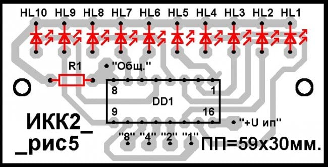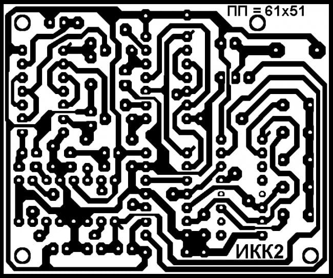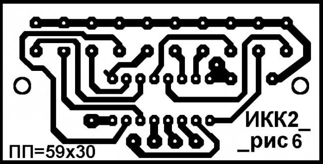 Основная печатная плата ИКК выполнена из односторонне фольгированного гетинакса или стеклотекстолита размерами 61 х 51 х 2 мм (см. рисунки 2 и 3).