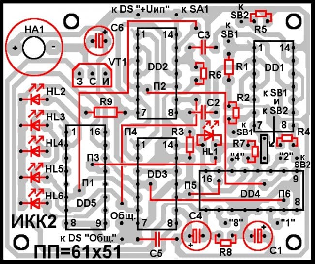 Настройка ИКК, собранной без ошибок и из исправных деталей, обычно не требуется. При использовании мигающего СДИ HL1 другого типа, резистором R7 (10k … 100k) может потребоваться уточнить частоту (около 2 Гц) тактового генератора. Частота генерации незначительно увеличивается с уменьшением сопротивления R7. Увеличить яркость свечения светодиодов HL2 … HL6 можно уменьшением номинала токоограничительного резистора R9 (общего для всех пяти СДИ). Добиваясь максимальной яркости свечения СДИ, следует помнить: уровень логической 1 на (соответствующих светодиодам HL2 … HL6) выходах счётчика DD5 не должен снижаться более, чем на 30-40% от номинального (близкого к U GB1). Оперативно уменьшить громкость звучания зуммера можно заклеив его звукоизлучающее отверстие кусочком скотча или изоленты.