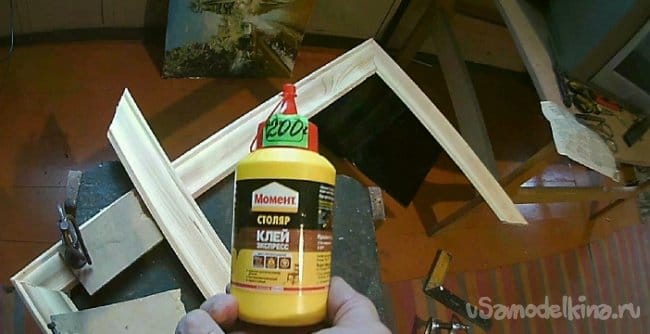 Эти способы хороши для прямоугольных и толстых сечений деталей. В моем случае, заготовка очень плоская, делать приспособление для склейки одной рамки не было нужды, это же не поточное производство, время не ограничено и поэтому, воспользовавшись струбцинками я на клей ПВА, клеил каждый угол отдельно.
