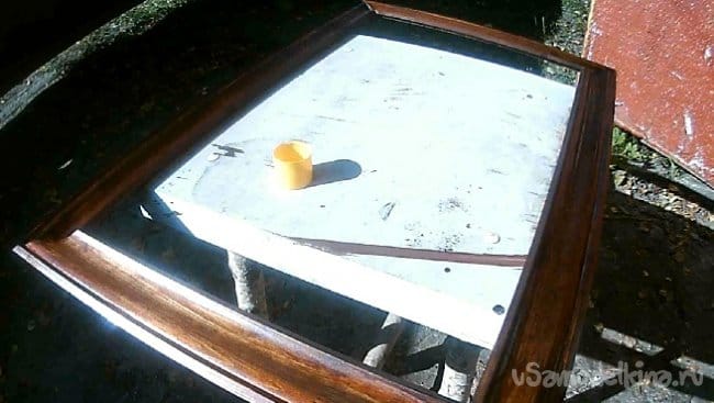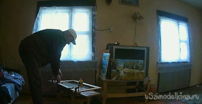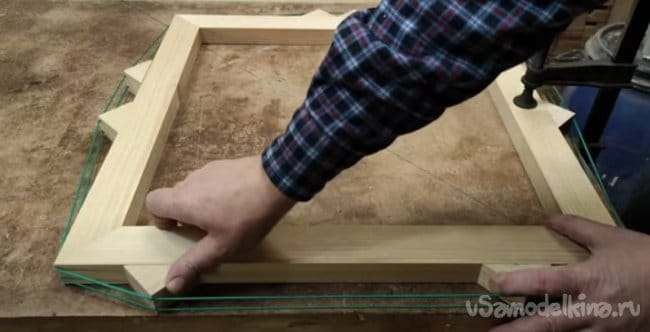 Для более крупных размеров можно применить стяжку при помощи треугольных распорок. Детали смазывают клеем, выкладывают рамку, на каждую сторону помещают по два треугольника и бечевкой дважды обкручивают по периметру. Для создания плотного прилегания запиленных деталей, перемешаем треугольники к углам. Или как еще вариант при помощи напарника, если позволяет размер, одевают велосипедную камеру, которая сжимаясь стягивает углы рамы