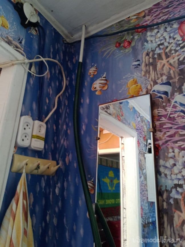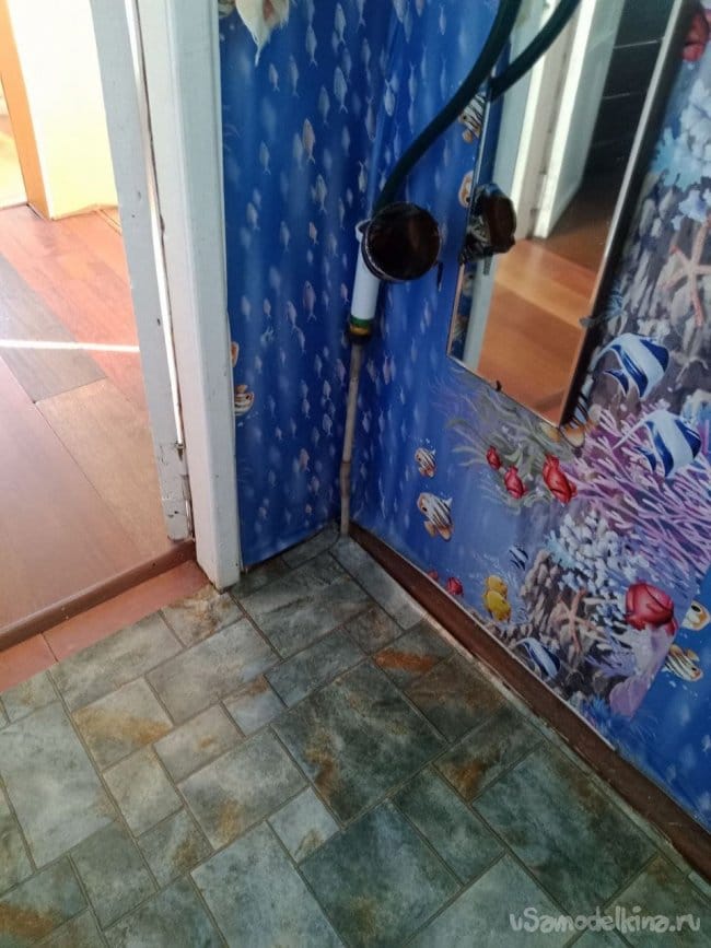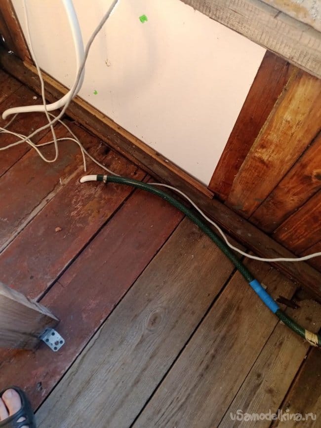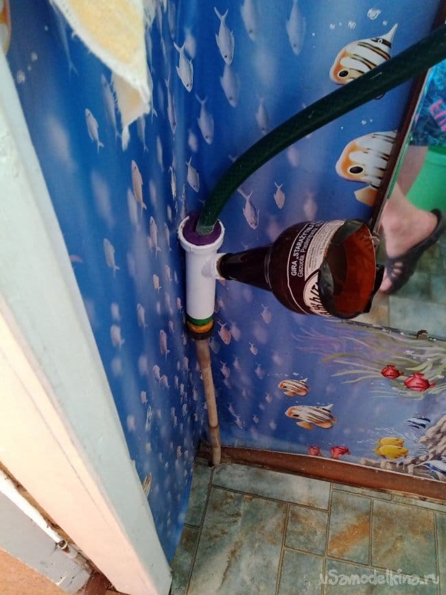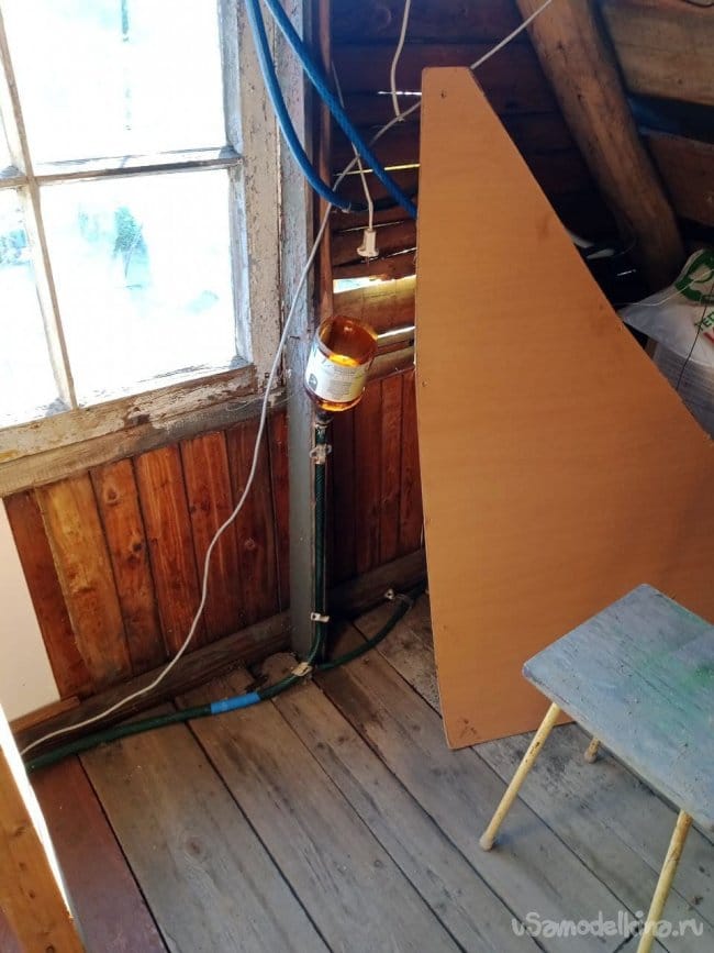 Для безопасности можно замотать край изолентой. Какой-то садовый шланг подошёл по диаметру, стыкуем его с будущим изделием и герметизируем скотчем. Проволочкой крепим изделие к какой-то деревяшке. Можно было и покрасивее сделать, но мой принцип «дёшево и сердито», а ещё быстро. Клипсы также в помощь. Стыкуем шланг с трубой 16 мм с помощью хомута. Труба уходит на первый этаж и сложным путём попадает под землю и потом в сточную канаву. Вроде неправильно, а с другой стороны там воды много, какие-то 400 грамм мочи погоды не сделают. Кошки, собаки и другое зверьё тоже писает, и ничего. Провели испытания, всё работает супер.