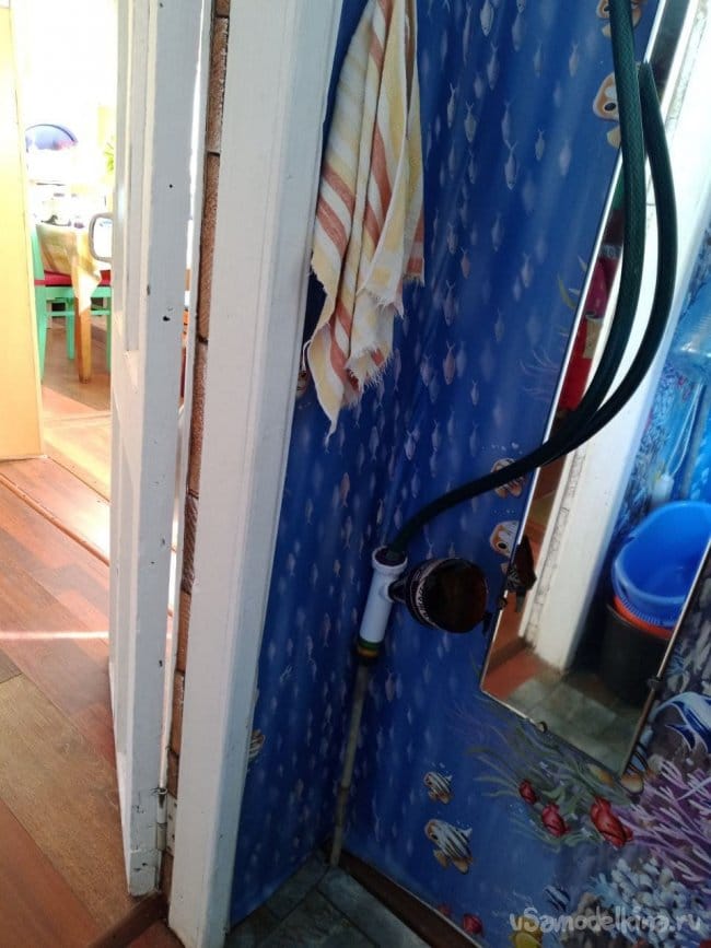 Через пару дней сын сказал, что тоже так хочет. Пришлось на первом этаже в душевой сделать ему врезку. Для более надёжного крепления пришлось порыться в сантехнической коробке и найти подходящую пластиковую фигнюшку типа дополнительного колена слива под раковину с наклонным входом для слива стиральной машины. Герметизируем пластилином, и готово! Всё, теперь нам не страшны дождь и прочие непогоды!