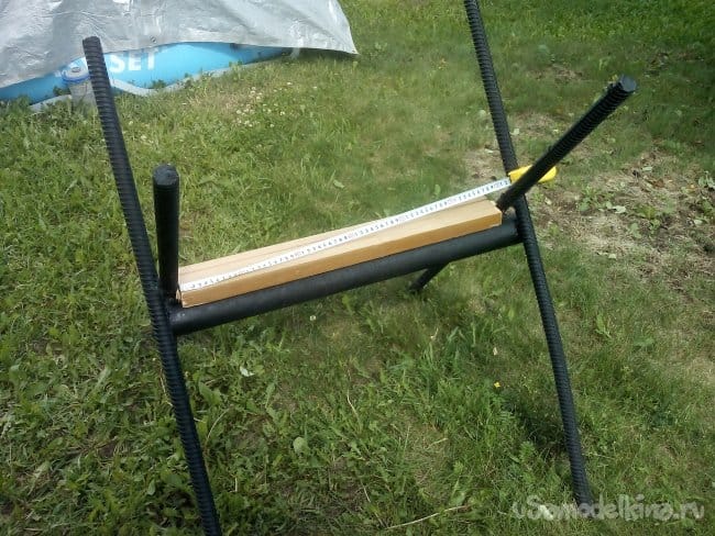 Скрестил стоймя 2 арматуры «на глаз» и прикинул примерное их примыкание дуг к ругу в «центре», со смещением его кверху и перенес все это на ровную горизонтальную площадку. Получилось от нижней части «ног», до центра пересечения арматур 650 мм. Так как обрезки арматуры были разной длины 1000 мм + 10 / 15 мм замер производил от нижней части конструкции, подрезать все арматуры в размер 1000 мм не стал, размер верхней V образной части «Х» боковин не сильно принципиален, и визуально разница в длине не ощущается.