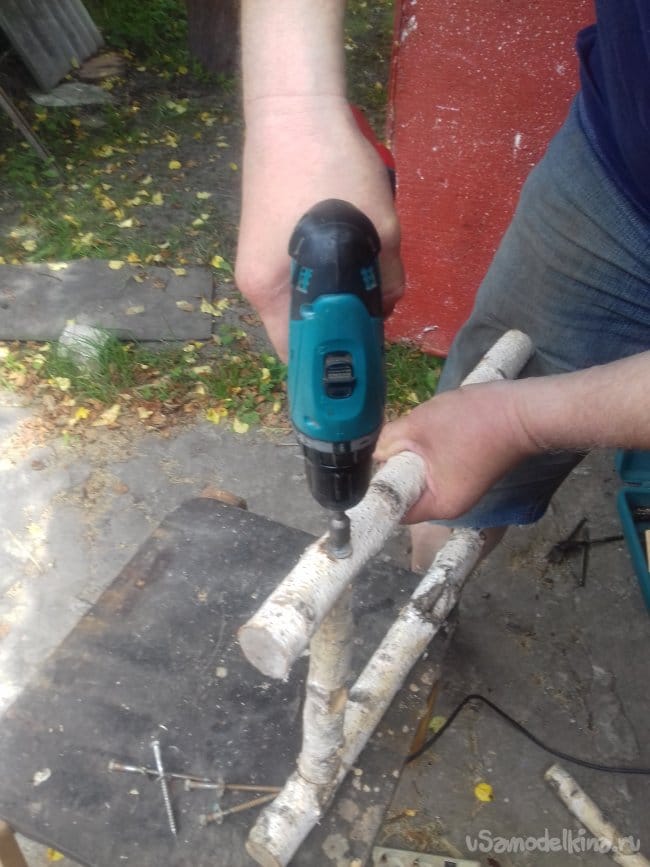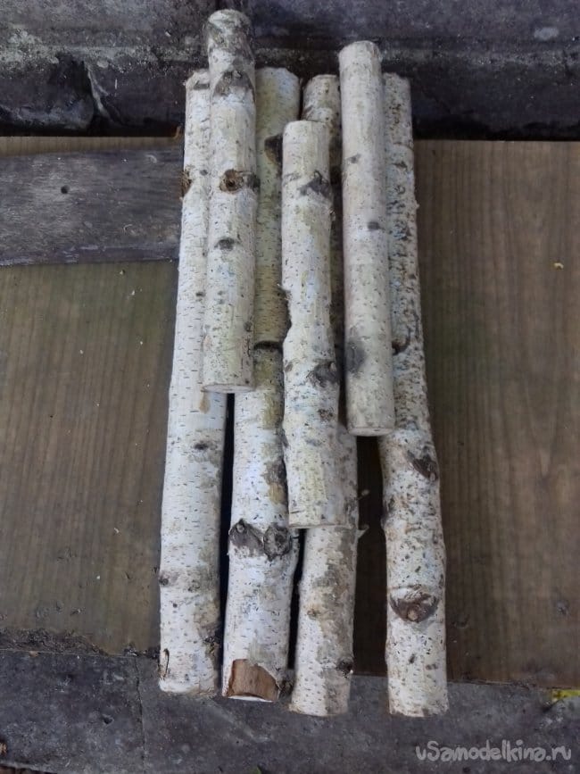 В связи с масштабной экономией и сокращением работников леса, лесной массив загажен дальше некуда. Кругом девственный бурелом и я себя ощущаю санитаром леса. Без особого труда, прогуливаясь, набрал за полчаса, более-менее крепких веток на табурет. Материал береза, очень распространенная древесина и заодно ее в по окончании работы не надо декорировать, достаточно просто пройтись щеткой по металлу.