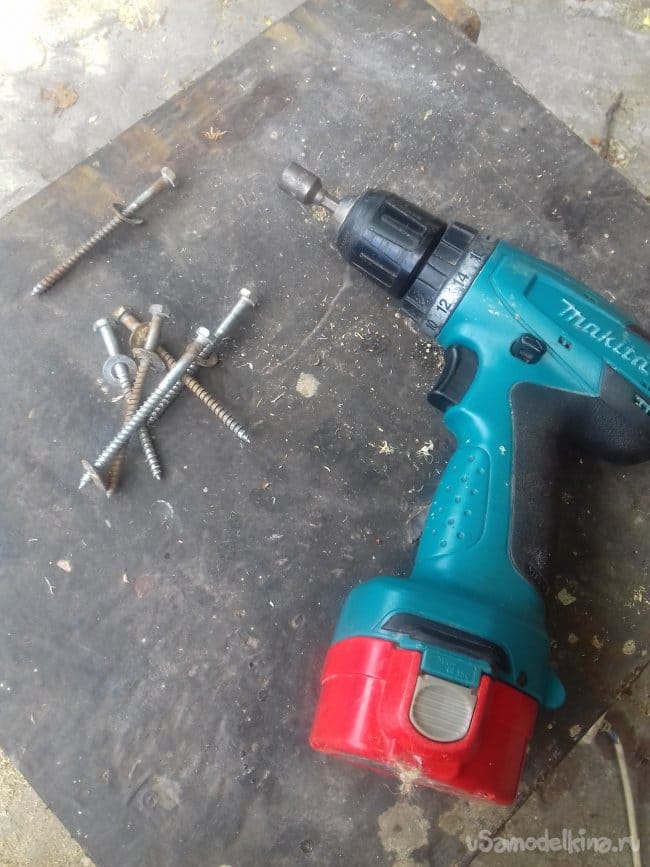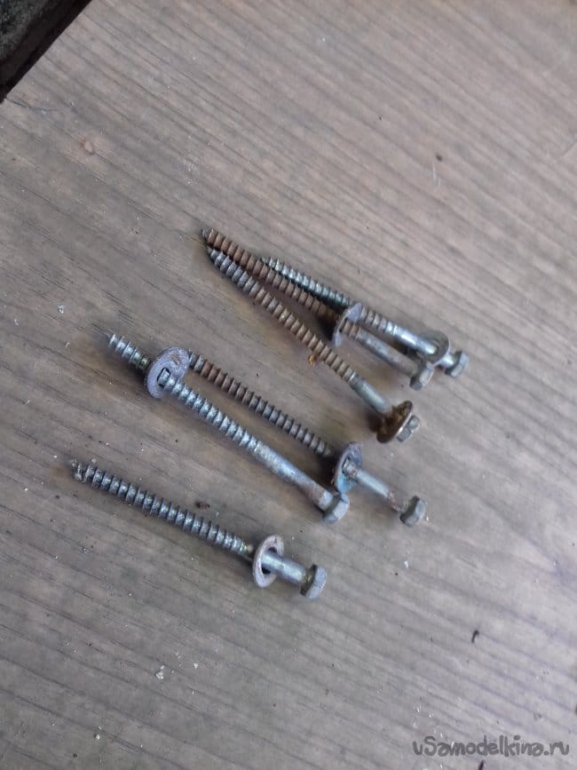 Ну и как водится, стараемся обходиться тем, что было уже в употреблении. А именно вывернул глухари 6х80, из старого разломанного забора, на некоторых даже шайбы сделаны из копеек СССР, которые аж позеленели от времени.