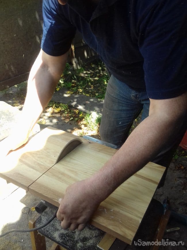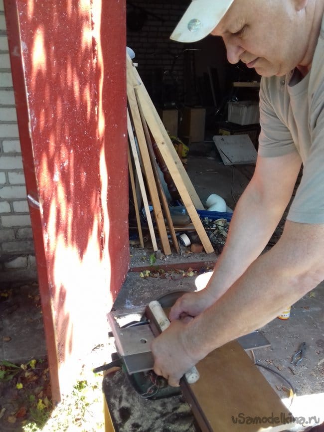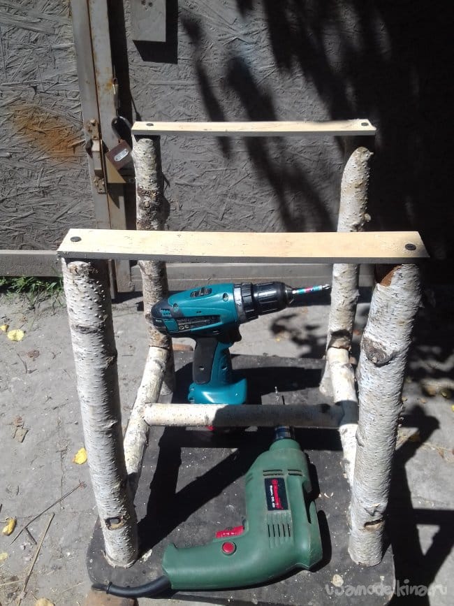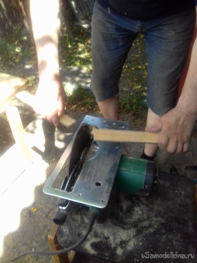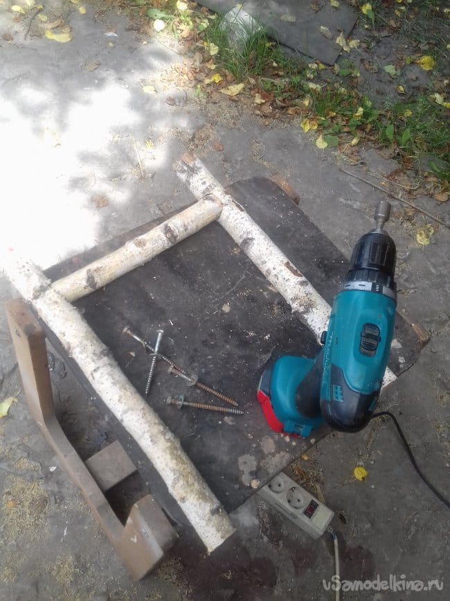 Добравшись до дачи, я очистил заготовки от грязи, разметил детали, по стандартным размерам имеющейся табуретки и на ручной циркулярной пиле отпилил по размерам ножки и перемычки
