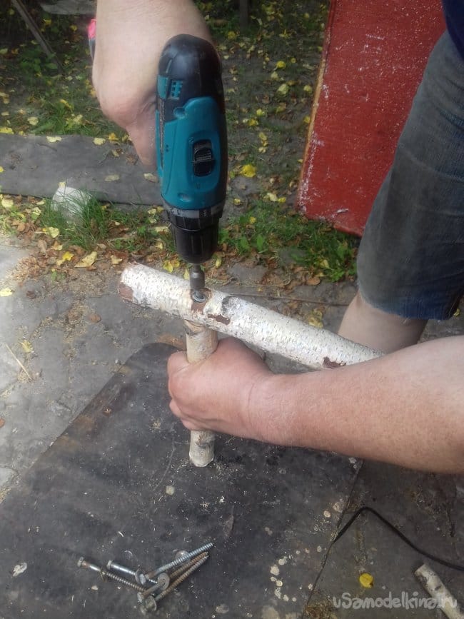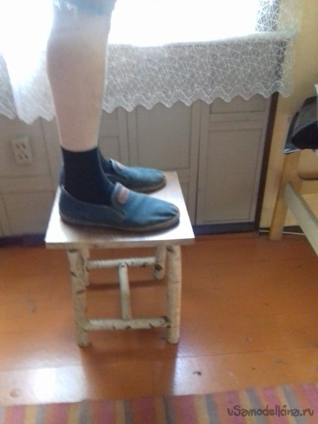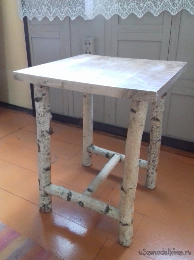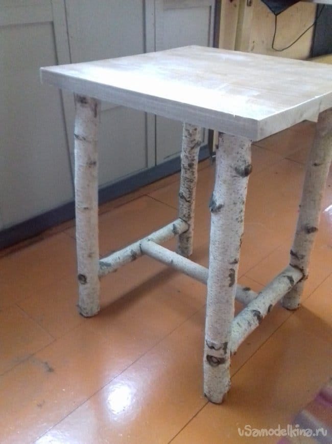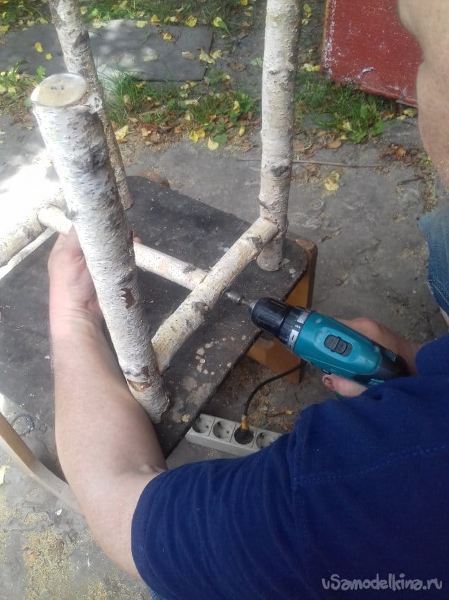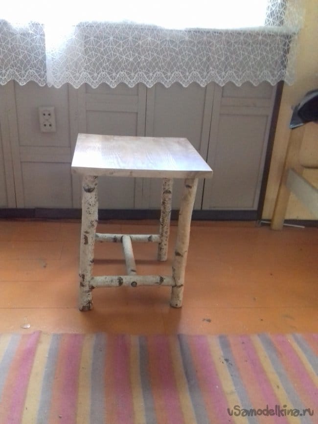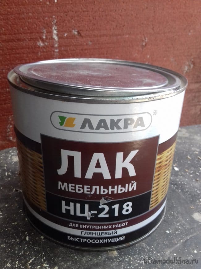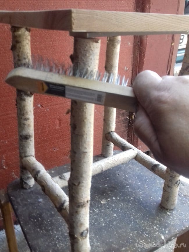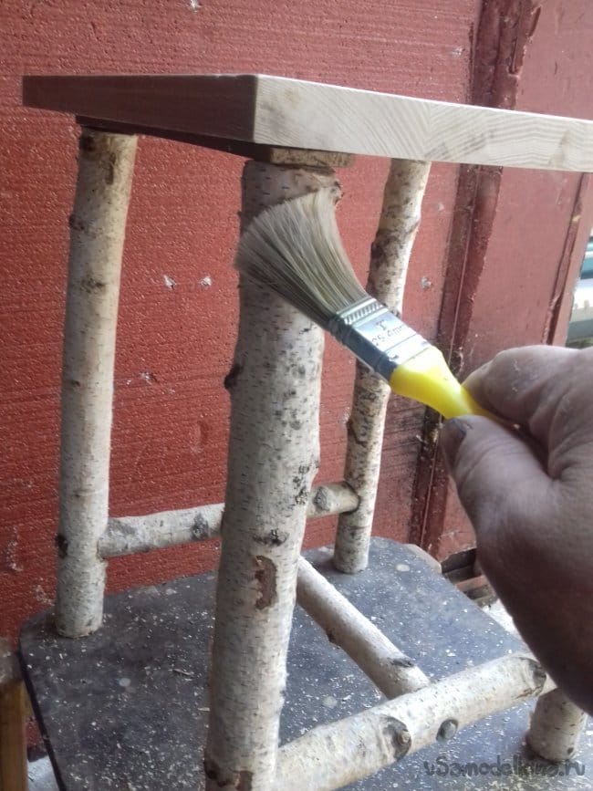 Из всего выше изложенного, вы поняли, что простенькую, страшно экзотическую мебель доступно сотворить каждому. Изделие получилось крепкое, хоть сиди, хоть танцуй, количество ограничено только вашей ленью. Завершаем проект лакировкой, это защитит изделие от грязи. Я зачистил ножки и перекладины щеткой по металлу, главное это делать без фанатизма. Взял кисть и покрыл нитролаком.