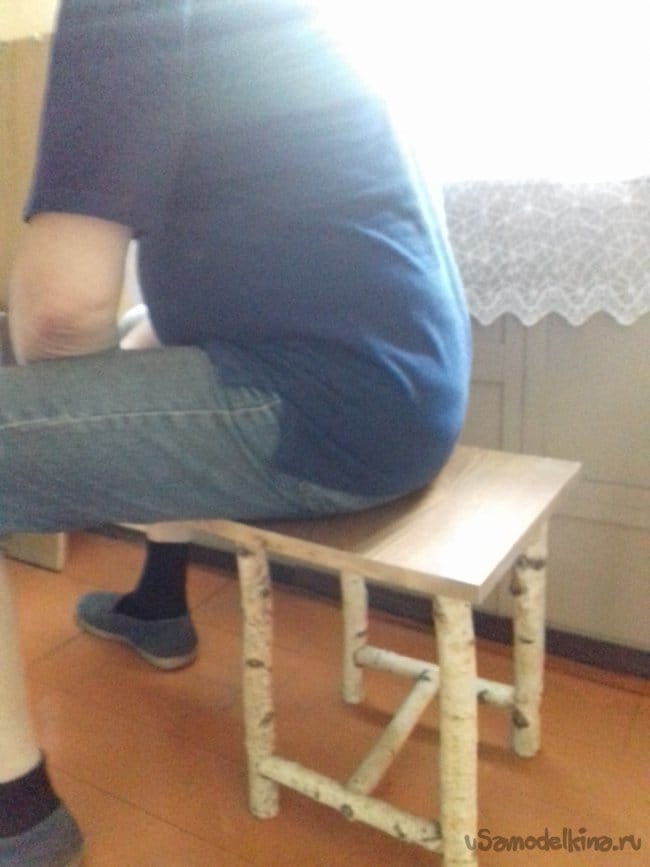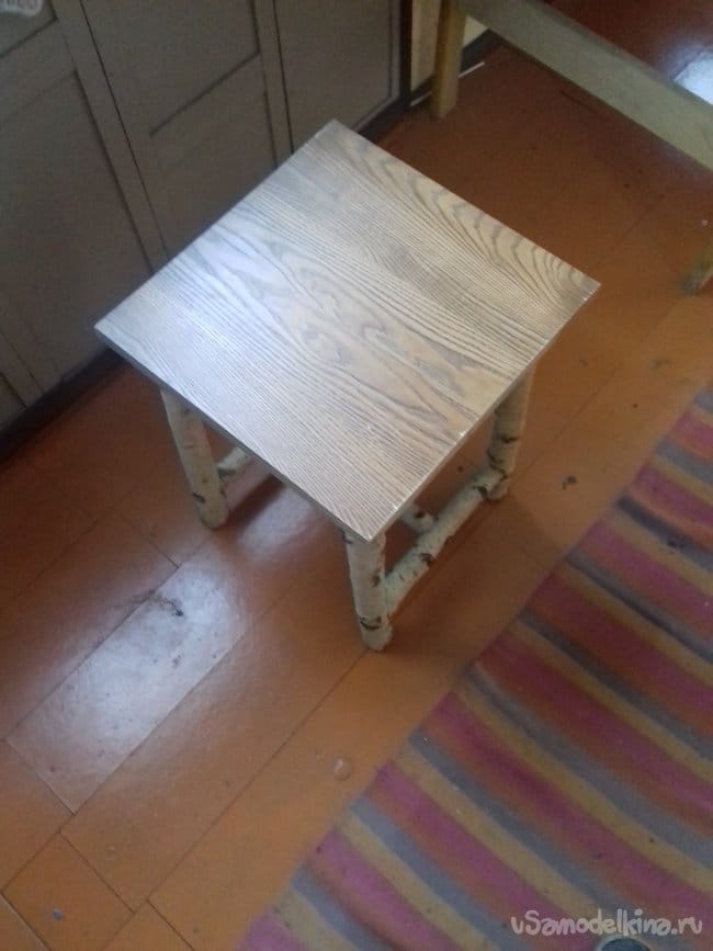 А еще, если этот табурет сделать высотой 800 мм, то у вас получится кухонный комплект. Для ножек стола нужно поискать в буреломе толщину 70-100, и чтоб были не очень кривые.