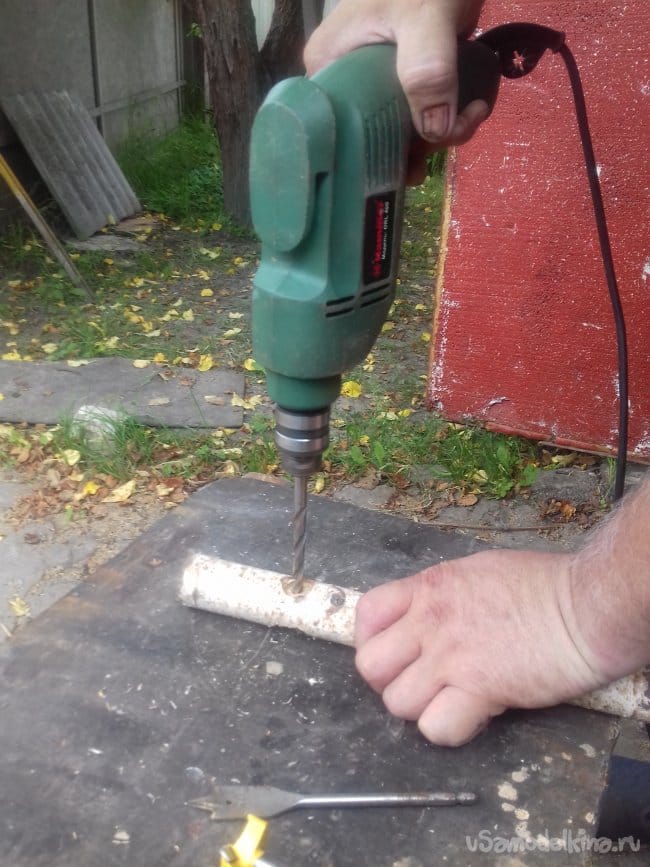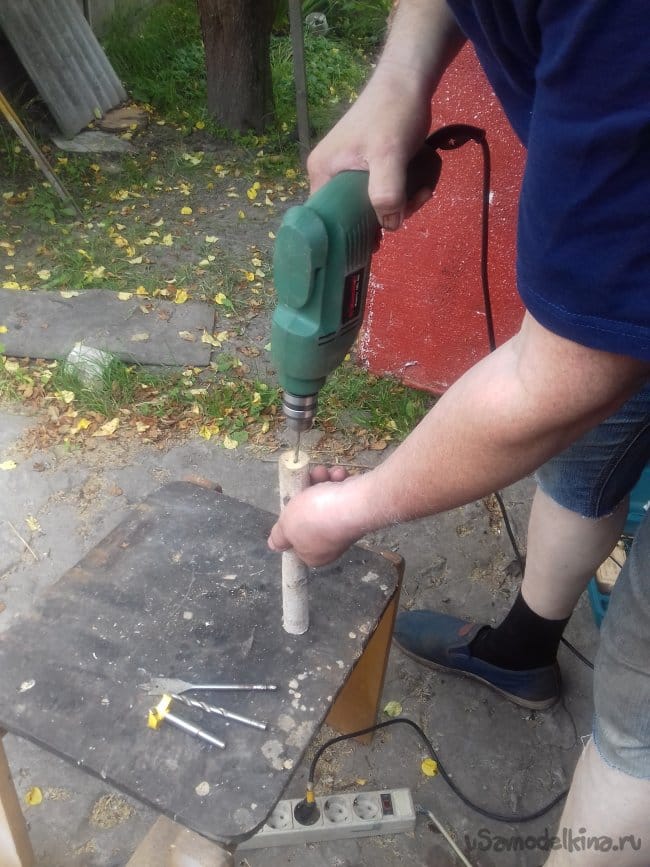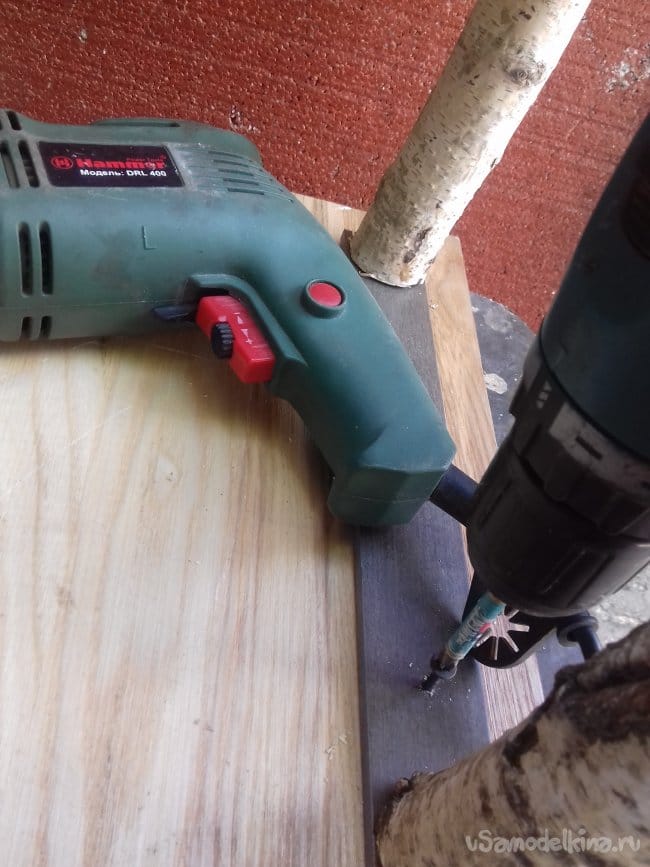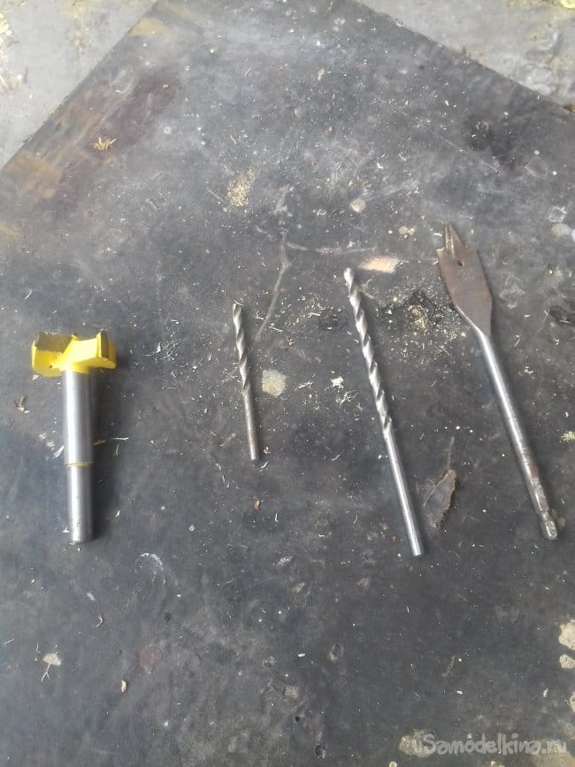 Затем вооружившись дрелью, сверлами 4 и 6 просверлил отверстия под глухари (крупные шурупы) и под резьбу. Под шайбы применил перьевое сверло на 20, это для углубления крепежа, а то будет торчать железяка из табурета, не дай бог портки порвутся. В местах соединения связующих деталей, также высверлил посадочные углубления фрезой для мебельных петель.