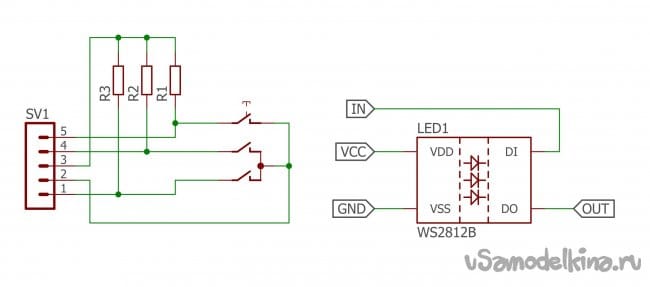 Схема управляющей части - упрощенная. Энкодер с кнопкой и ряд адресных RGB диодов: