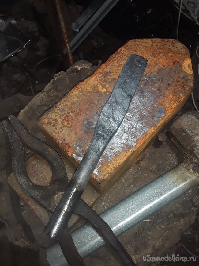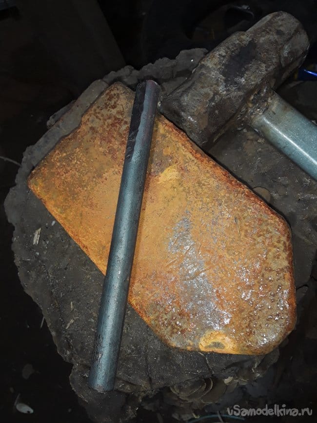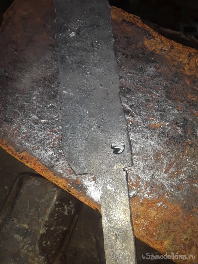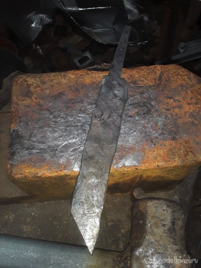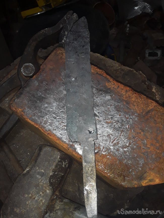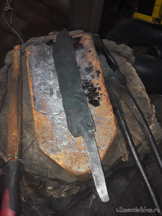 Прут стали прокатный не имеет закалку так что можно отжиг не проводить, а сразу приступать к ковке клинка. И так все как всегда ничего нового не скажу просто, нагреваю и кую нож. Нагреваю кругляк до светло алого цвета и придаю форму пластины толщиной 4 мм и так по всему кругляку далее будет проще работать с поковкой. После того как отковал примерный профиль болгаркой отрезаю под углом с противоположной стороны лезвия далее нагреваю кончик и загибаю на краю наковальни придаю нужную форму острия. После приступаю к формированию спусков и проковав до 2‐х мм толщены почти краю режущий кромки. Теперь так же болгаркой отрезаю от хвостовика все лишнее и после нагрева придаю окончательную форму хвостовика вот и все с ковкой настал ответственный момент это закалка.
