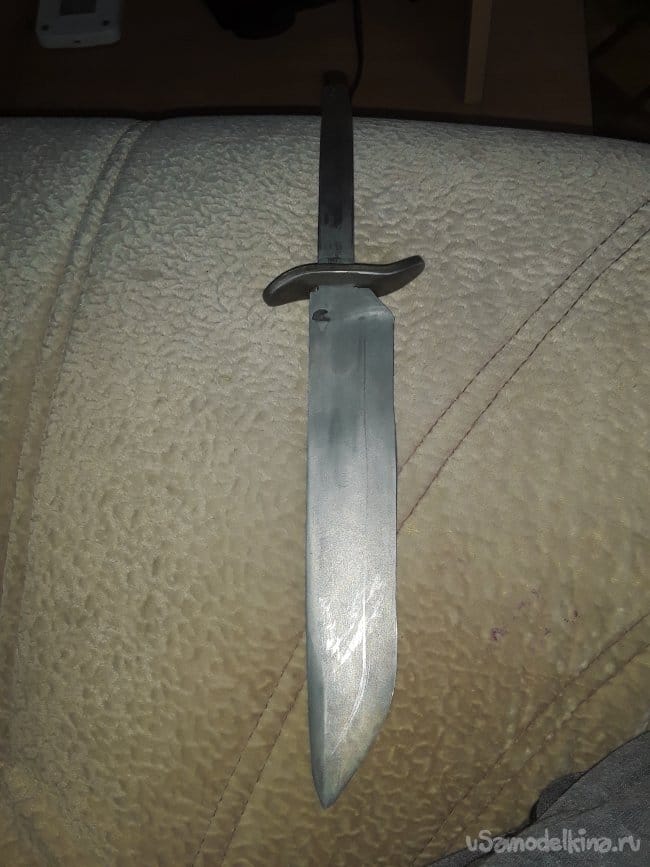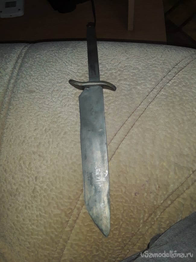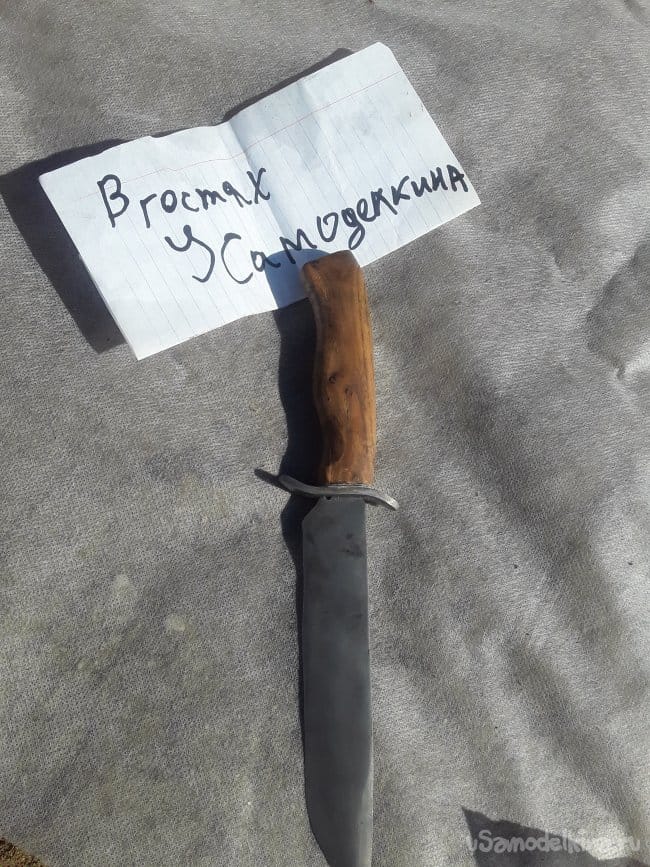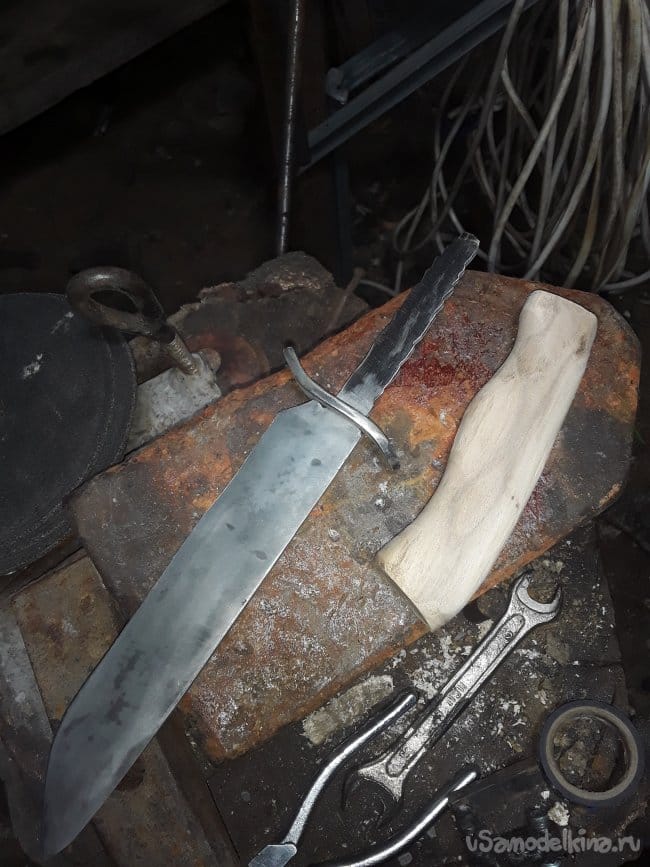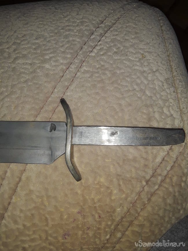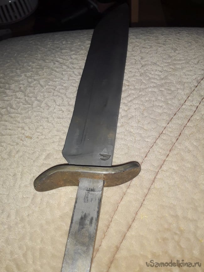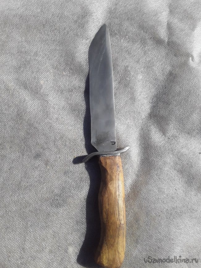 Нагреваю заранее масло на горне в котором будет производиться закалка и нагреваю клинок до необходимой температуры и произвожу закалку затем после остывания проверяю закалку на стекле если не царапает стекло то произвожу закалку еще раз, но мне повезло и закалка произошла с первого раза. Сразу же пока металл свежий произвожу отпуск при температуре 250°C в течении 4‐х часов. Вот и все закалка завершена после отпуска все слесарю до блестящего цвета и протравливаю в лимонной кислоте сутки, а пока травится приступать к изготовлению упора для пальцев. Хозяин попросил чтобы я, сделал упор для пальцев как на финке, так как будет производить закол скота. Долго не мучился с упором все просто выточил на наждаке с какой-то железяки и так же протравил в лимонке после протравки просверлил и подогнал все к хвостовику все получилось четко и красива, а главное как надо. Хотя такой упор считается как холодное оружие, но на свой страх и риск все же изготовил и не забыл предупредить будущего хозяина об этом в общем то с металла обработкой все приступаю к изготовлению рукояти.