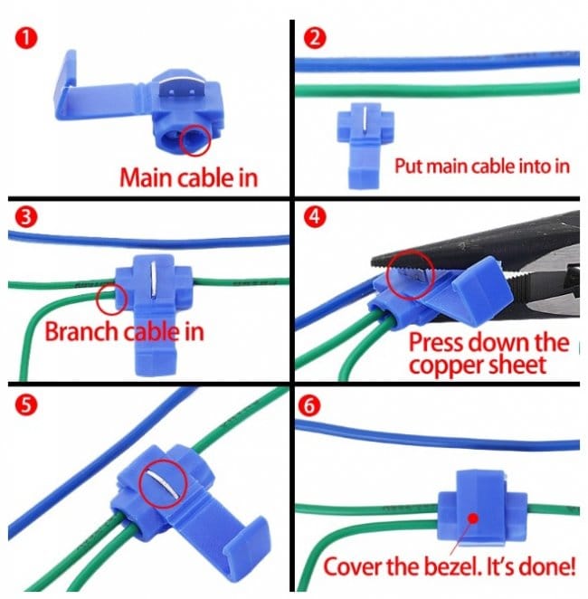 Данные соединители представляют собой пластиковый корпус, выполняющий роль изоляции, внутри которого размещен U-образный прокалывающий, луженый контакт. Главным достоинством таких ответвителей является то, что их монтаж осуществляется посредством прорезания изоляции, и потому полноценная зачистка провода не потребуется. Кроме того, из инструментов понадобятся лишь самые обычные плоскогубцы. Весь процесс установки соединителей будет представлен на картинке ниже.