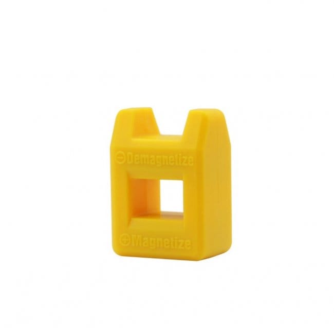 Подобные приспособления предназначены для размагничивания или намагничивания всевозможного мелкого инструмента по типу отверток или пинцетов, а также бит для шуруповертов. У данного продавца представлено три разных вида такого устройства: большой, средний и маленький. Наиболее удобным видится самый большой намагничиватель — он оснащен удобными отверстиями для намагничивания/размагничивания круглых отверток или бит. Изготовлены все представленные позиции из качественного АБС-пластика. На корпусах устройств нанесена информация о том, какая часть инструмента отвечает за размагничивание, а какая — за намагничивание.