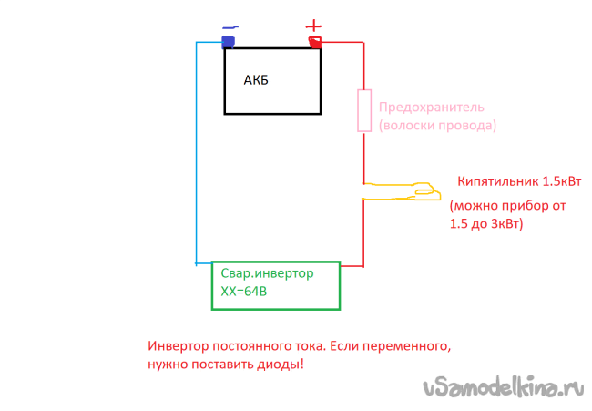 Обязательно используйте плавкий предохранитель, который защитит от ошибочной подачи напряжения напрямую от инвертора на АКБ!!! У меня это пару волосков многожильного провода.