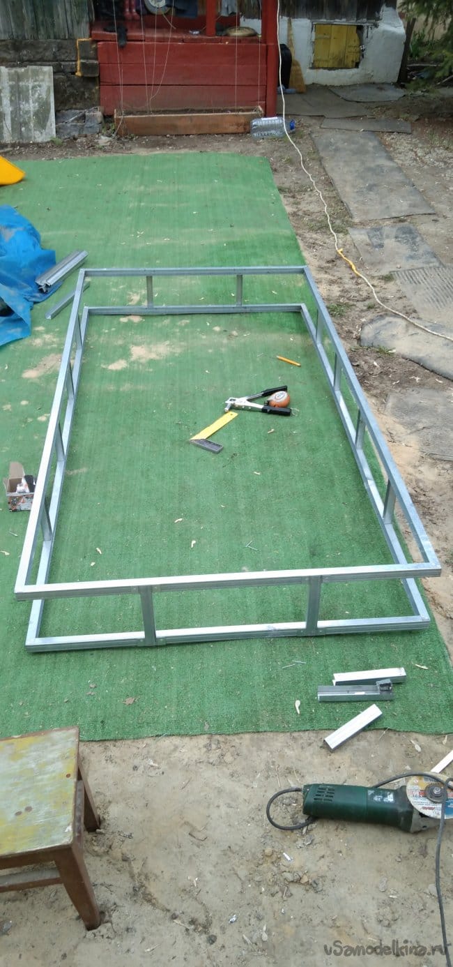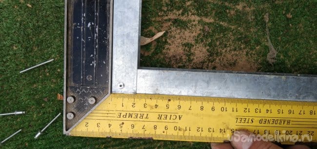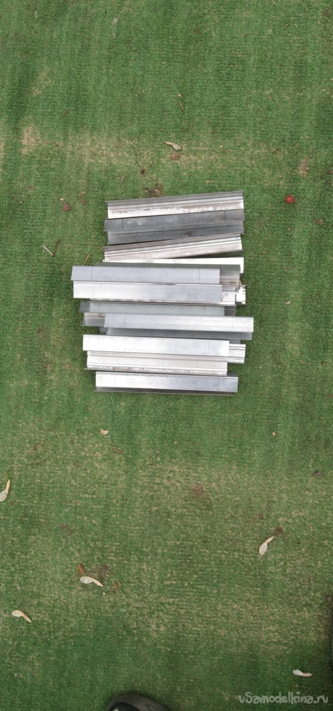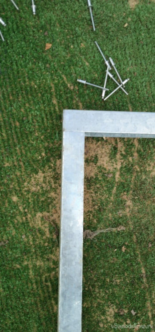 Для основы грядок был выбран профиль для гипсокартона, размеры которого 30х30 мм. Собственно, выбор на него пал именно потому, что у меня он уже был. Остался после изготовления стеллажей. Длина профиля равна 3 метрам. Грядки у меня будут размерами 2х1 метр. С помощью ножниц по металлу сделал разрезы по бокам заготовки, на расстоянии 1 метра от края. Полученную конструкцию согнул в виде буквы "Г", закрепив угол вытяжными заклепками. Таких деталей на одну грядку необходимо 4 штуки. Затем детали соединяю между собой, чтобы получился прямоугольник. Крепления делаю теми же вытяжными заклепками. Получаются такие вот части: