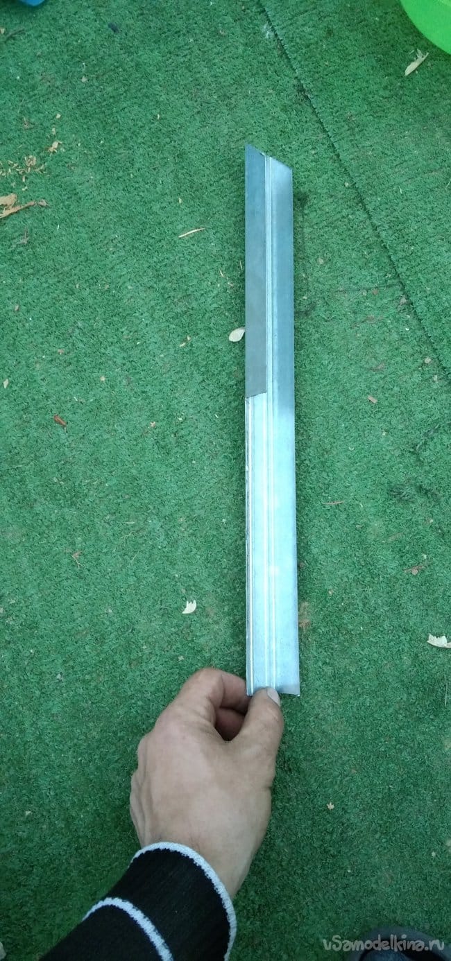 Теперь нужно сделать ножки грядкам. Кроме этого они будут еще закрывать углы грядок, закрывая места крепления стенок. Отмеряю на профиле 40 см и отрезаю. Одну сторону, 20 см длиной полностью отрезаю, чтобы ножка полностью легла на угол грядки, закрывая его. На другом конце делаю угол в 45 градусов, чтобы было удобно и легко посадить грядку в землю. Здесь уже для крепления понадобились саморезы по металлу, т.к. длины заклепок уже не хватило. Затем в пазы верхних стенок установил поперечную перекладину. Она придаст грядке большую прочность, земля не выдавит стенки наружу. Хотя при таких размерах она и так не выдавила бы, но все же. И еще эта перекладина может играть разделительную роль, отделяя друг от друга растения разных видов. Лепестковым диском убрал все заусенцы на бортах грядок, чтобы исключить возможности поранить руки об острые края.