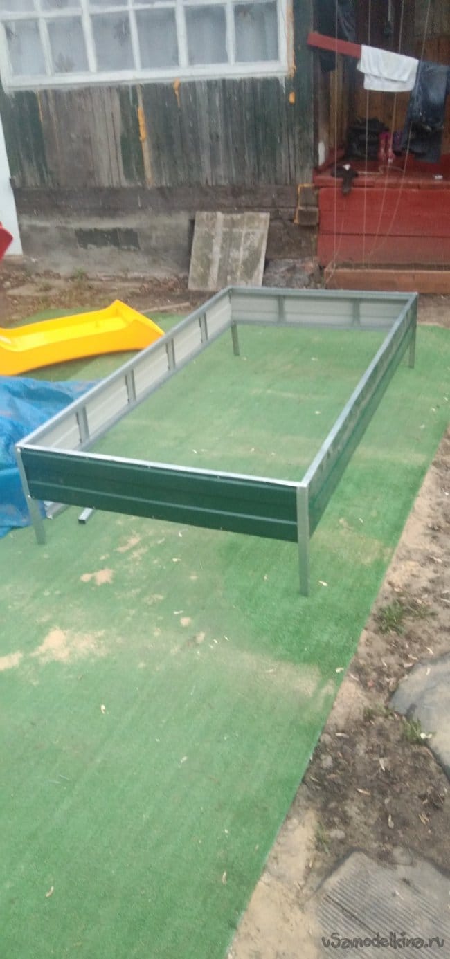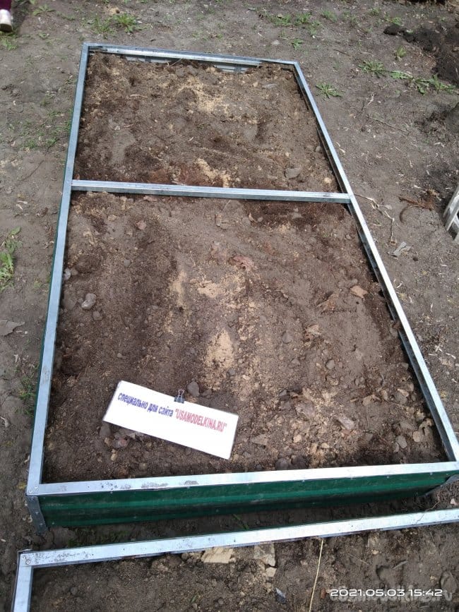 Установил грядки в необходимое место и вдавил ножки в грунт. Затем насыпал земли. Супруга высадила растения.