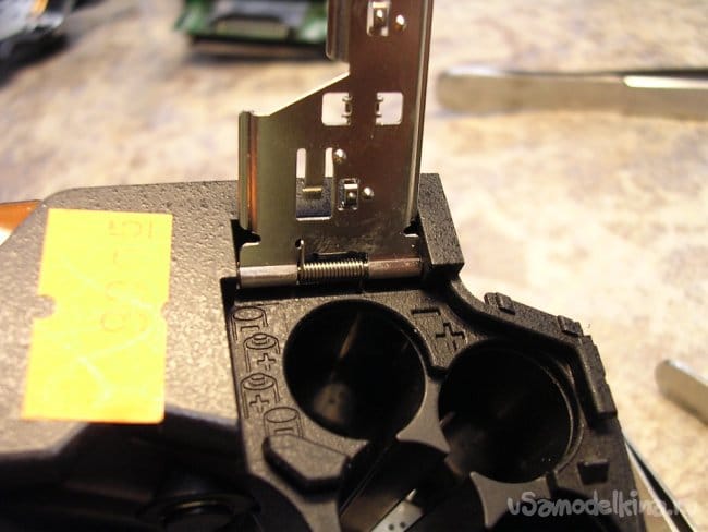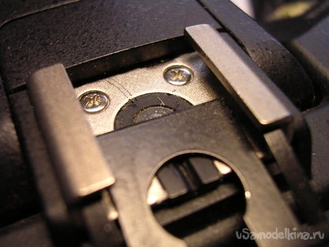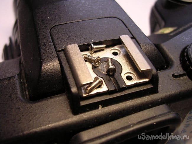 "Горячий башмак". Сдвигаю пластинку пружины фиксирующих внешнюю вспышку. Под ней четыре болтика.