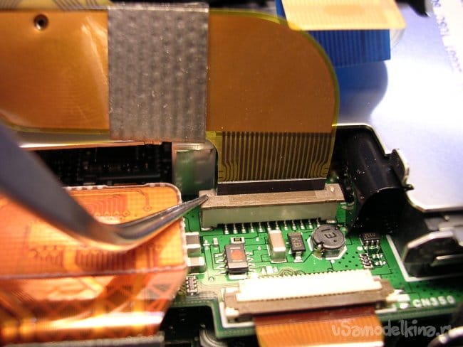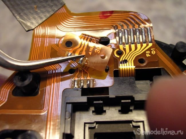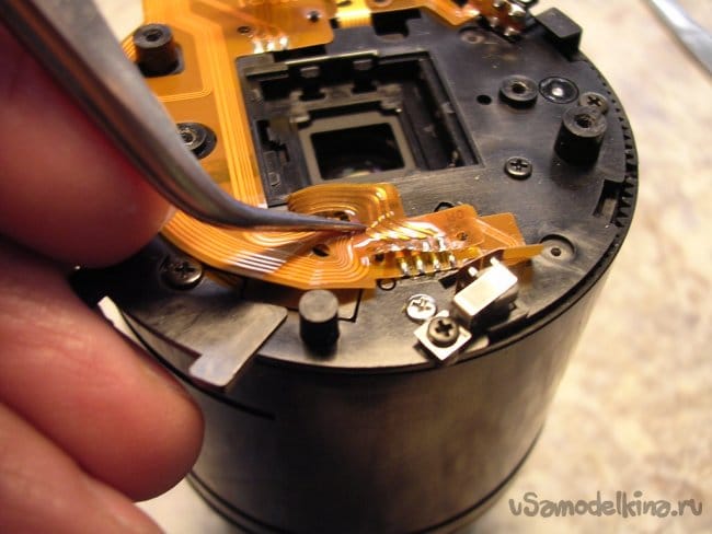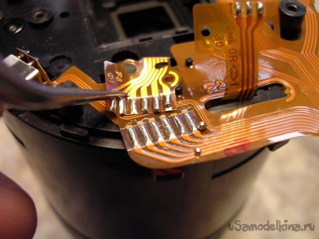 После сборки объектива тыкаю щупами в шлейф управления выдвижением объектива. Все работает, движется и даже очень плавно.