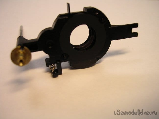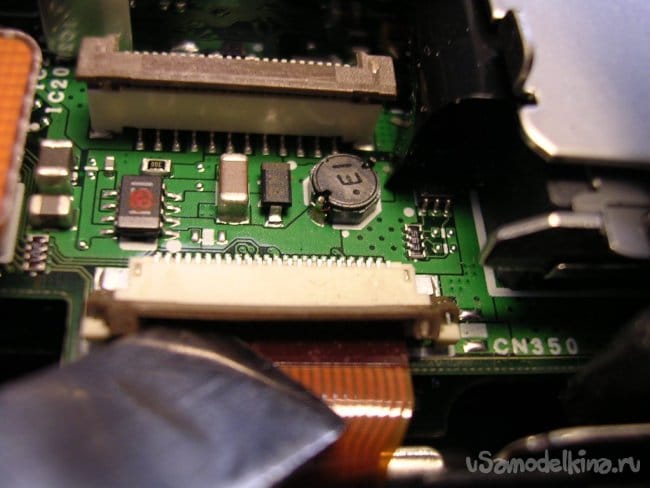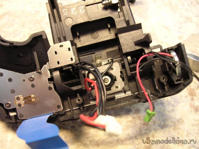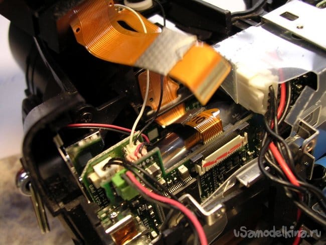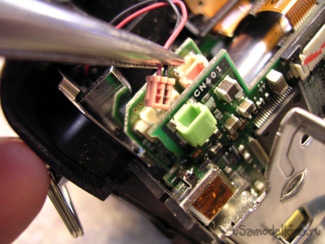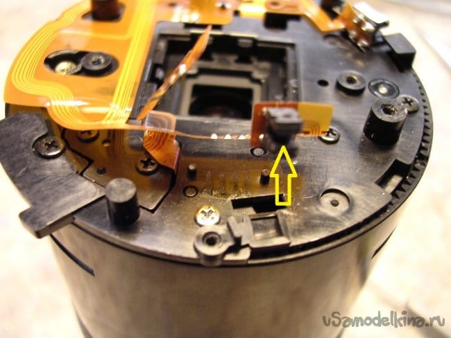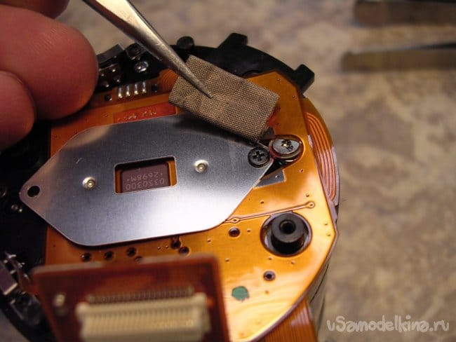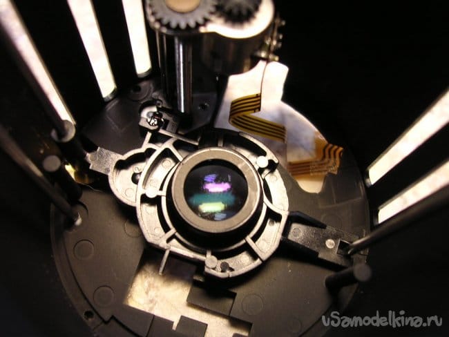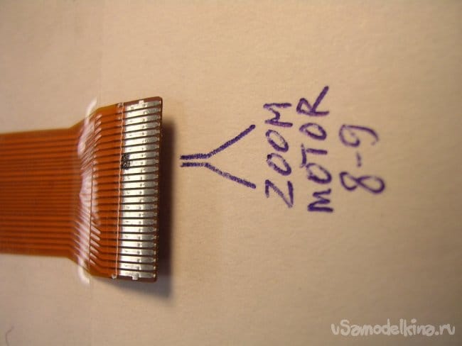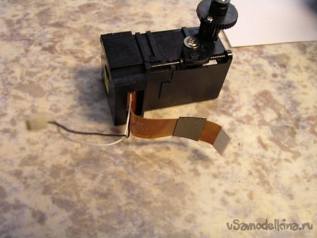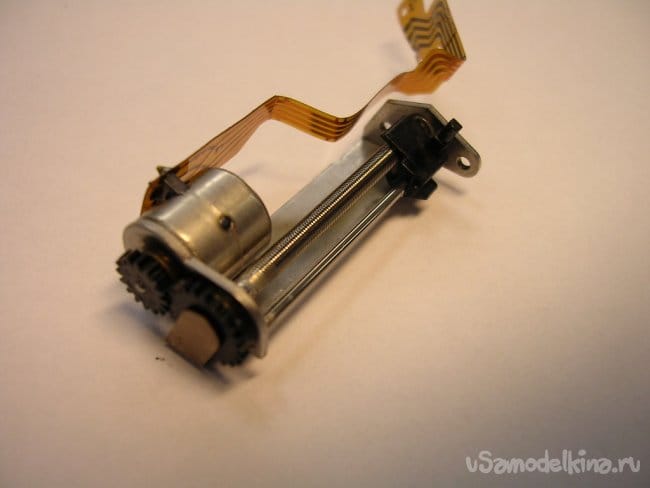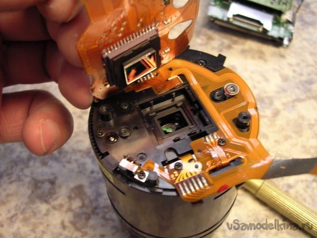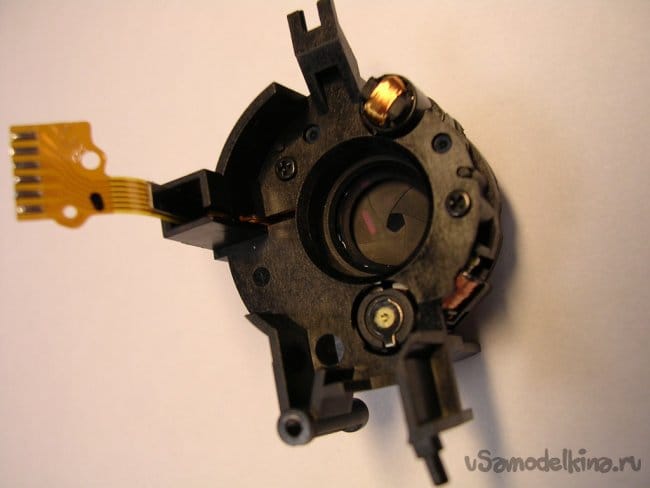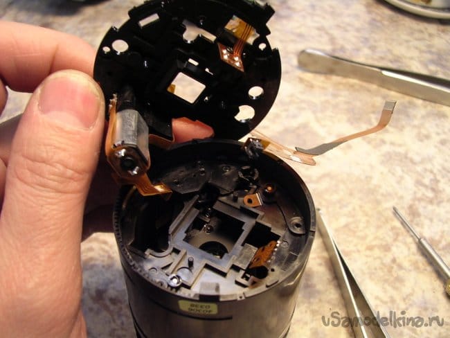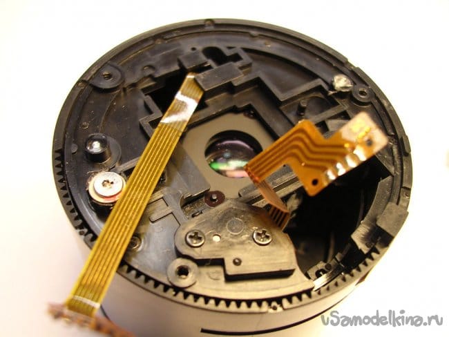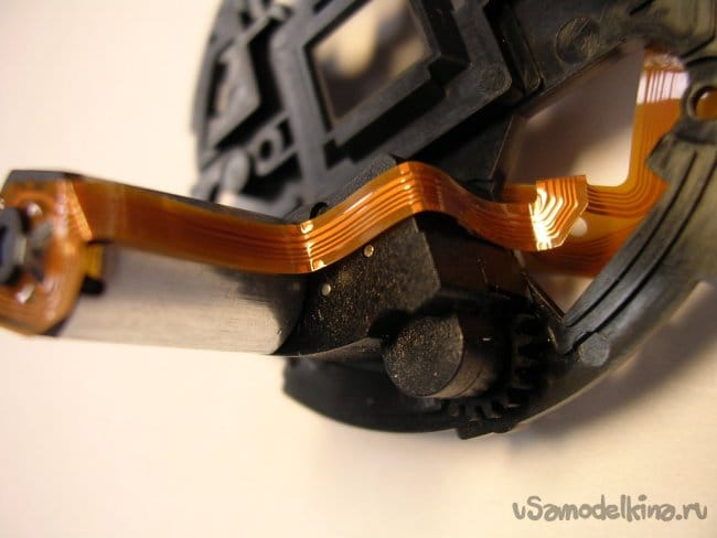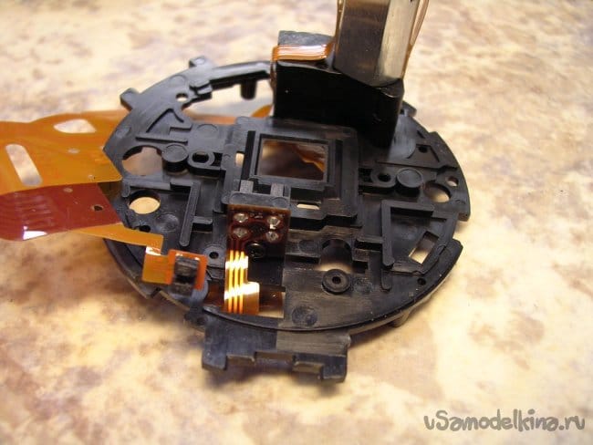 Вот и моторчик с редуктором выдвижения объектива. Тыкаю в контакты на шлейфе по питанию. Все работает и жужжит, ну и УРА!
