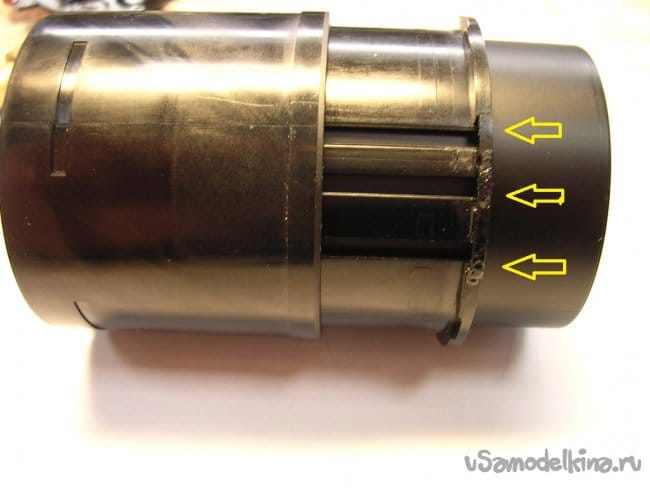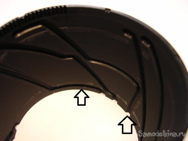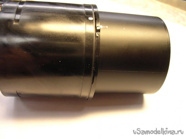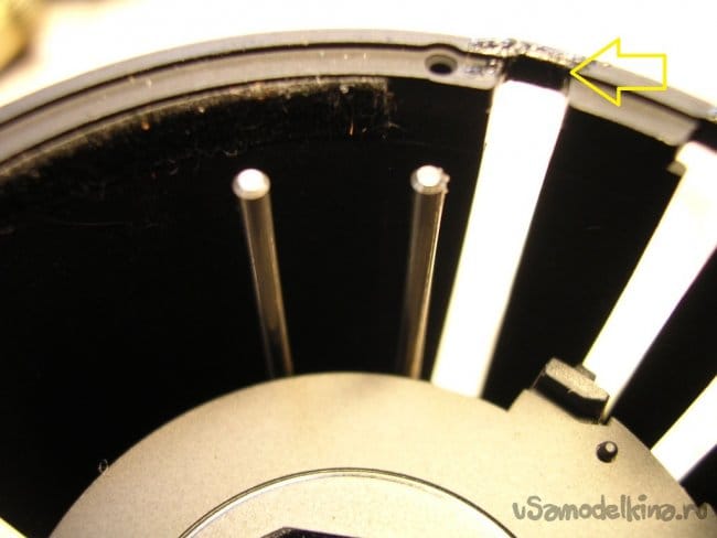 На внутренней поверхности основного барреля повреждения от сорвавшихся пинов. Сепаратор в нескольких местах поврежден по краю расколот. Склеиваю циакрином и приглаживаю место склейки паяльником. Будет держаться, поскольку сепаратор зажат в пространстве между двумя бочками. Может конечно разломиться по склейке, если объектив еще разик приложить посильнее.
