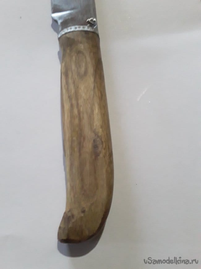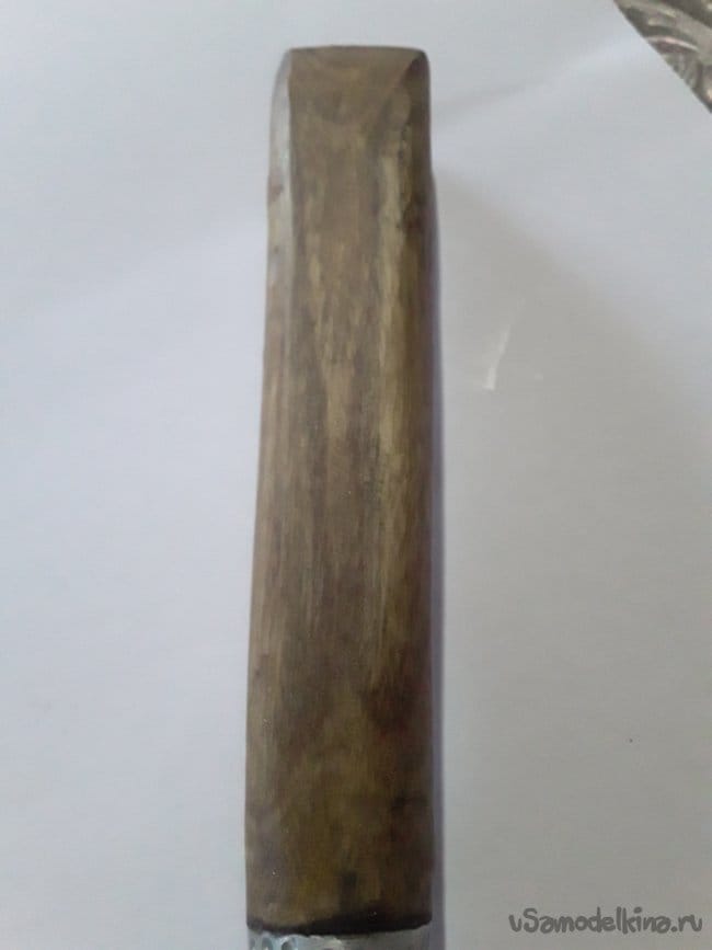 Для рукояти использую сухую древесину яблоню отрезаю нужной длинны кусок просверливаю отверстие в центре и временно насаживаю забив кусочек дерева для больстера использую кусочек алюминия. При обработке дерева сильно нагревается и подгорает, а так лента ест дерево хорошо недавно делал нож и рукоять сделал с дерева карагач мне очень понравилось с ним работать иногда даже из-под ленты летели искры, но оно не горело да и лента брала плохо, но зато после пропитки дерево открывает свой неповторимый рисунок. На этот рукоять использую дерево яблоня ни когда еще не работал с собственно заготовленной древесинной фруктовых. Наверно как то неправильно сушил потому что дерево скрепилось и треснуло по краям и именно поэтому пришлось стабилизировать так хоть немного укрепится дерево да и от влаги дерево не набухнет и не потеряет свою форму. После пропитки маслом натираю рукоять расплавленным воском и полирую, но не в блеск иначе рукоять будет скользить из руки.