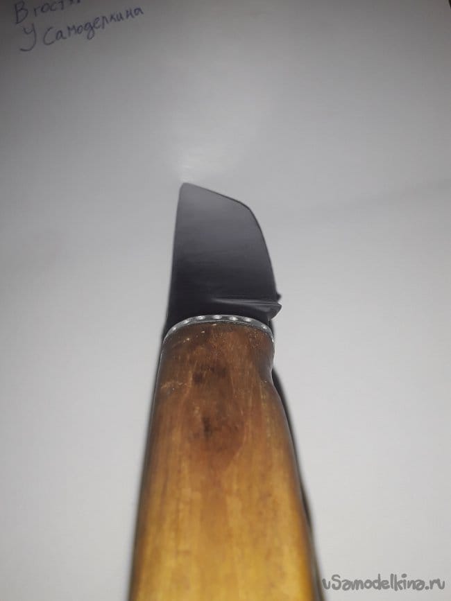 Нагреваю до ярко-красного цвета и остужаю, и приступаю к ковке для удобства ковки сначала проковал в в пластину, а далее формирую форму ножа при ковке заметил что металл мягкий как пластилин, и нагревается очень быстро так что сжечь заготовку очень легко. При ковке острия сначала с противоположной части отрезаю под углом, а затем загинаю как нужно ну а после проковать хвостовик. После всего окончательно проковал толщину обуха до 2‐х мм так же проковал спуски оставляю 1мм чтобы при слесаре не сжечь и при закалке чтобы не сжечь. Далее произвожу нормализацию простыми словами нагреваю и остужаю на воздухе пару раз. И сразу же после последнего нагрева приступаю к закалке клинка. Закалка ножа происходит в гидравлическом масле по всей площади нагреваю в муфельной печи до 950°C и окунаю в теплое масло где-то 70°C после закалки подвешиваю на веревочку остывать. После закалки произвожу отпуск в печи с плавным остыванием отпуск начинаю с 750°C и до 100°C в течение 3‐х часов. Ну вот и все после закалки клинок упругий, но стекло не царапает. Приступаю к изготовлению рукояти.